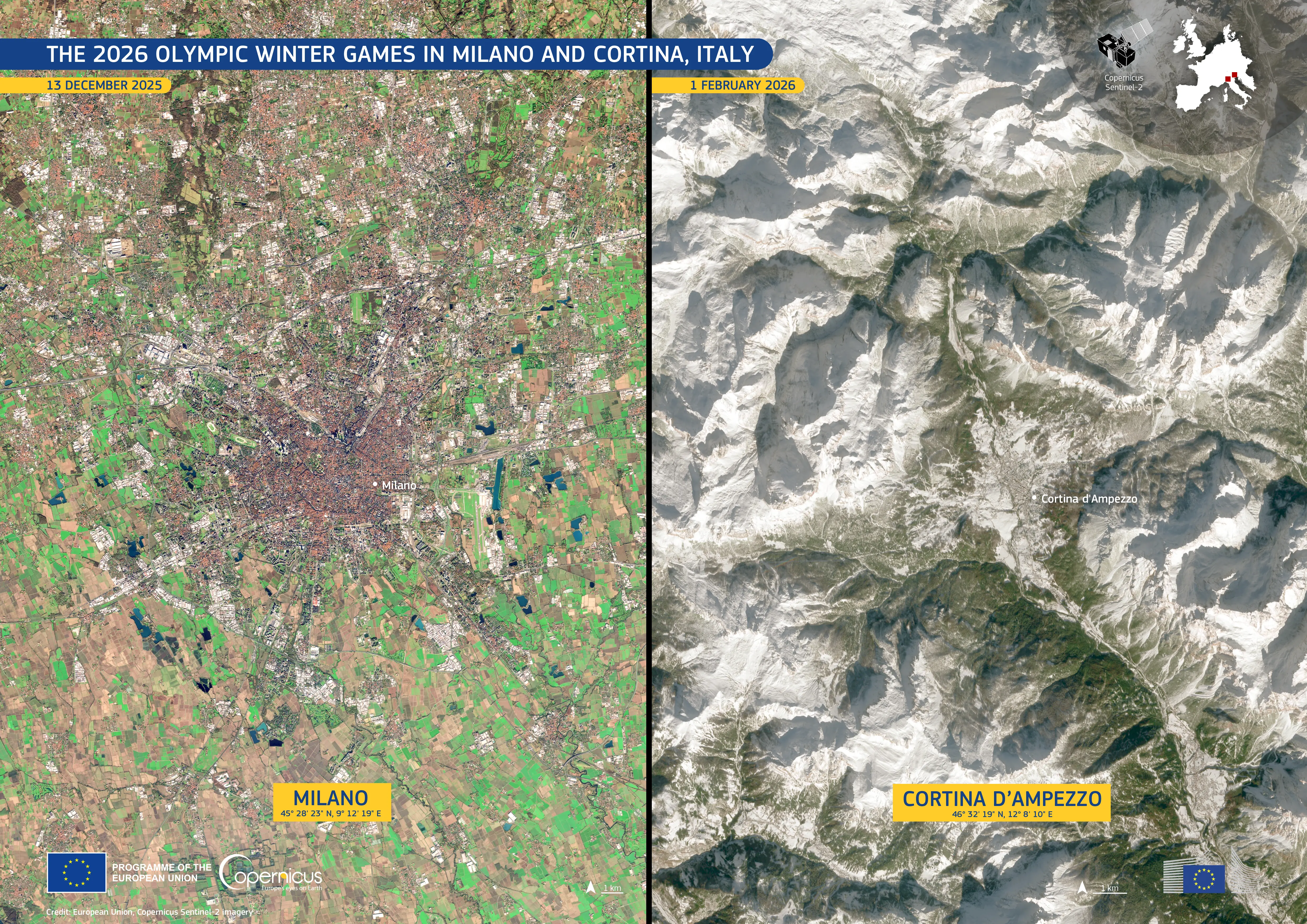 These Copernicus Sentinel-2 images, acquired on 13 December 2025 and 1 February 2026, respectively, show the city of Milano and the winter landscapes of Cortina d’Ampezzo in the Dolomites mountain range. Both locations will serve as headquarters of the Games.