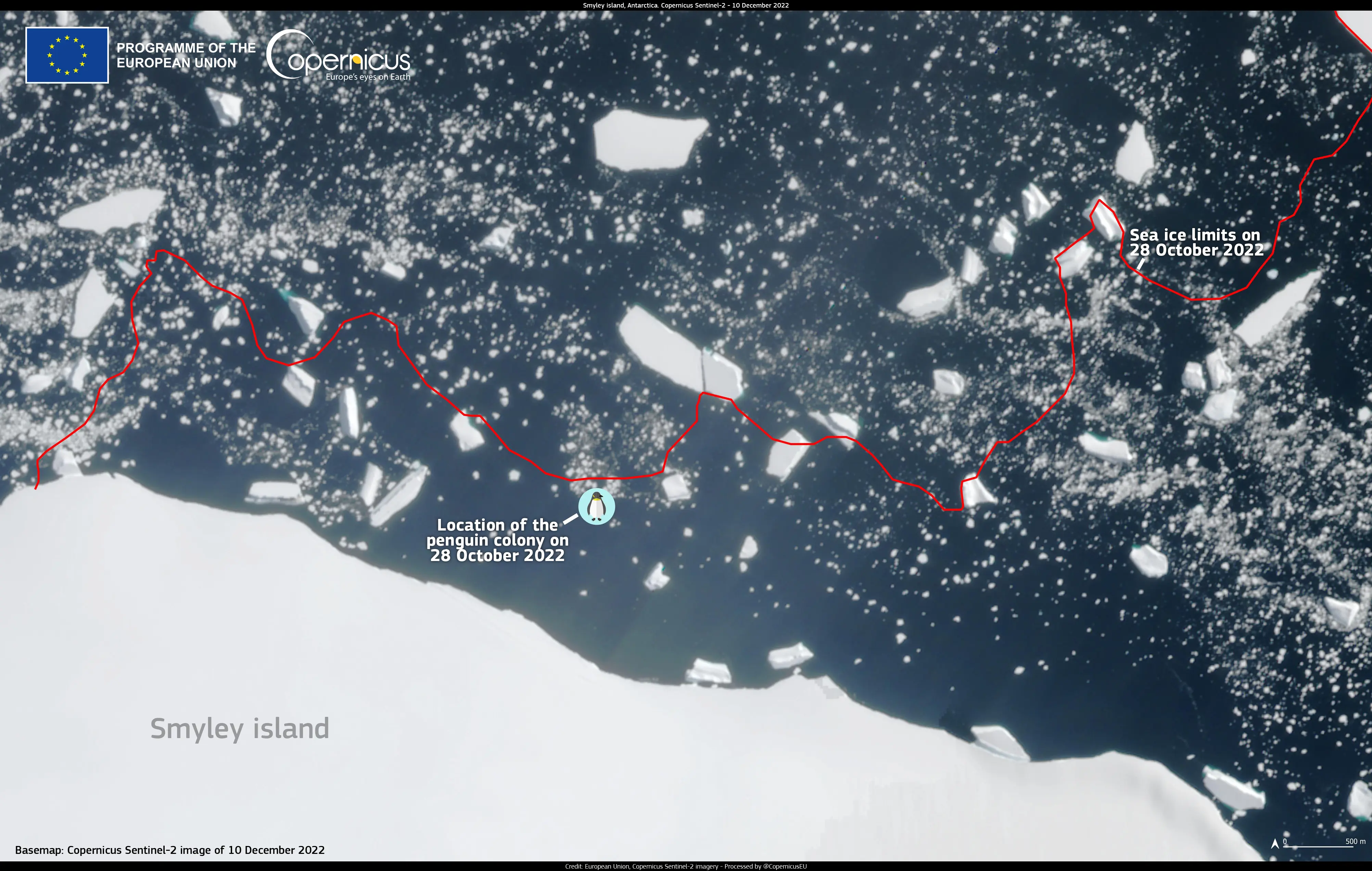 This discovery was made possible through the use of Copernicus Sentinel-2 satellite data, providing direct observation of entire colonies failing to raise any chicks. This image, acquired on 10 December 2022, by Copernicus Sentinel-2A, shows the coastal area of Smyley Island, one of the areas home to the penguin colonies.