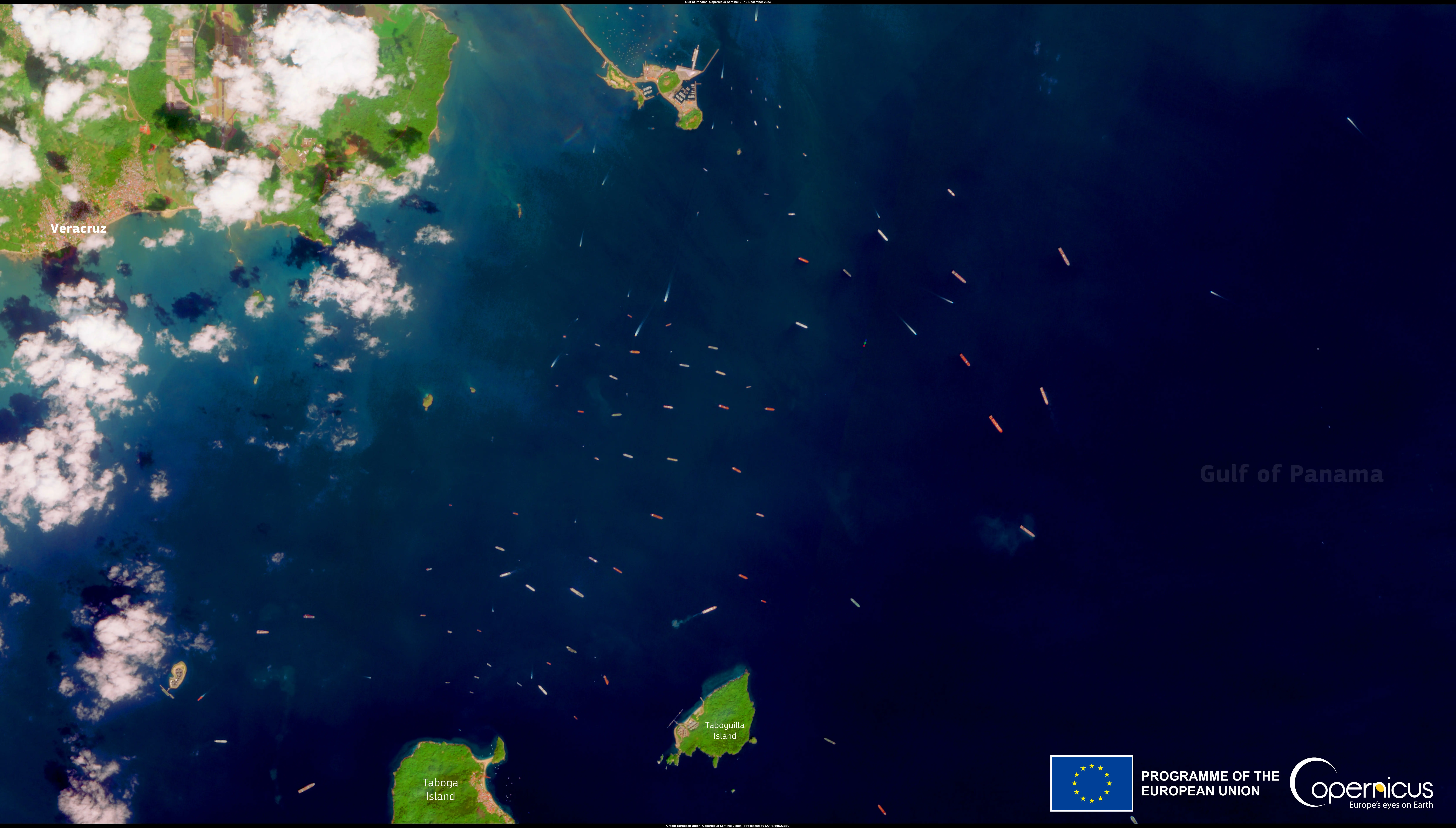 The vessels anchored in the Gulf of Panama waiting to pass through the canal can be seen in this image acquired by one of the Copernicus Sentinel-2 satellites on 10 December.