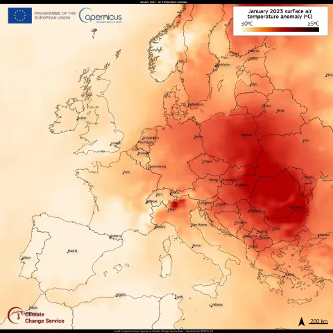Temperatures above reference average values continue to be recorded in Europe. According to the latest climate bulletin published by the Copernicus Climate Change Service (C3S), January 2023 has been the third warmest January, with temperature anomalies reaching +5ºC peaks in Romania, Bulgaria, Ukraine, Poland, Hungary, and Slovakia.