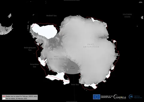 This data visualisation, generated with CMEMS data, shows the Antarctic sea ice extent on 25 February 2025 in white. The reference sea ice extent for February is outlined in red.