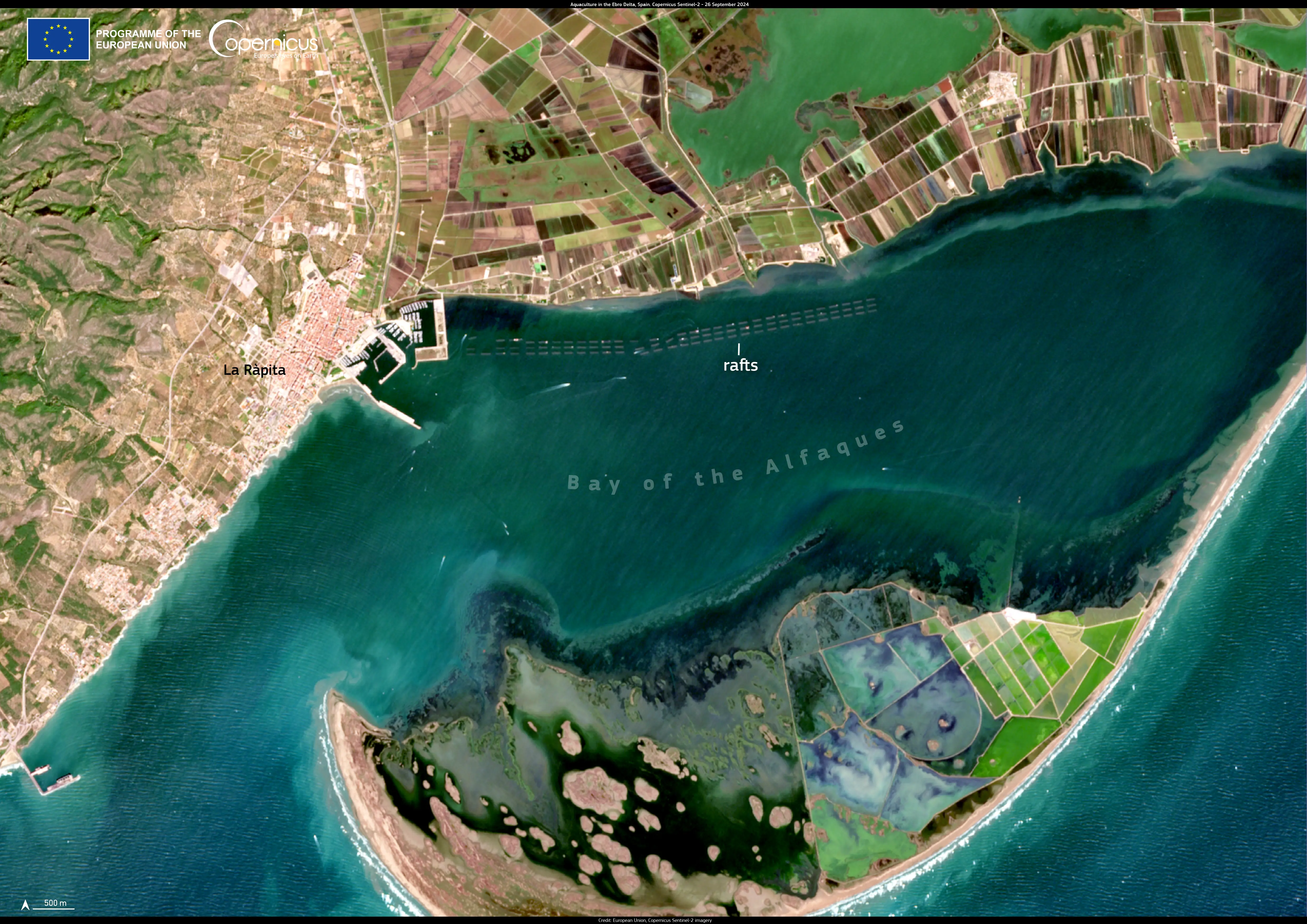 This Copernicus Sentinel-2 image acquired on 26 September 2024 shows aquaculture rafts in the Bay of the Alfaques, near the town of La Ràpita, Spain.