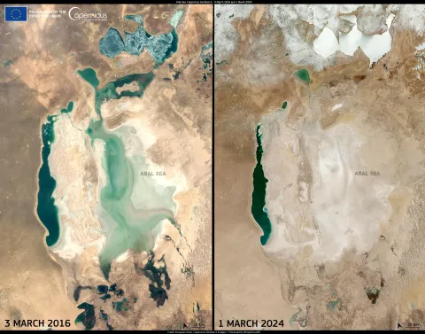 These images acquired by Copernicus Sentinel-2 satellites on 3 March 2016 and 1 March 2024, respectively, show the decrease in the Aral Sea’s water level.