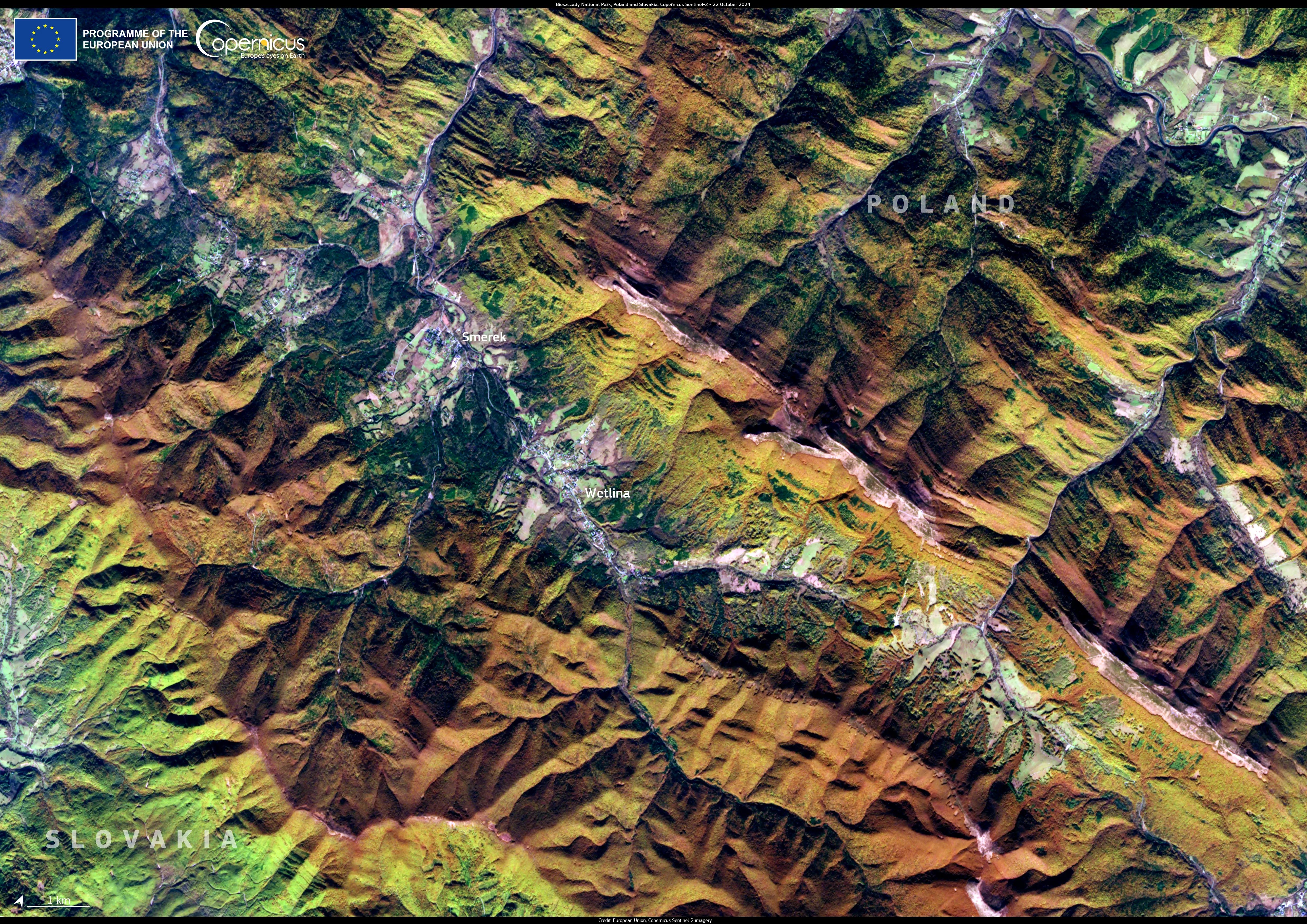 The park’s yearly explosion of colour is visible in this Copernicus Sentinel-2 image acquired on 22 October 2024. In the centre of the image are the towns of Smerek and Wetlina, located along the Great Bieszczady Loop, a route providing stunning views of the region. To the southwest, part of the Prešov region of Slovakia can be seen.