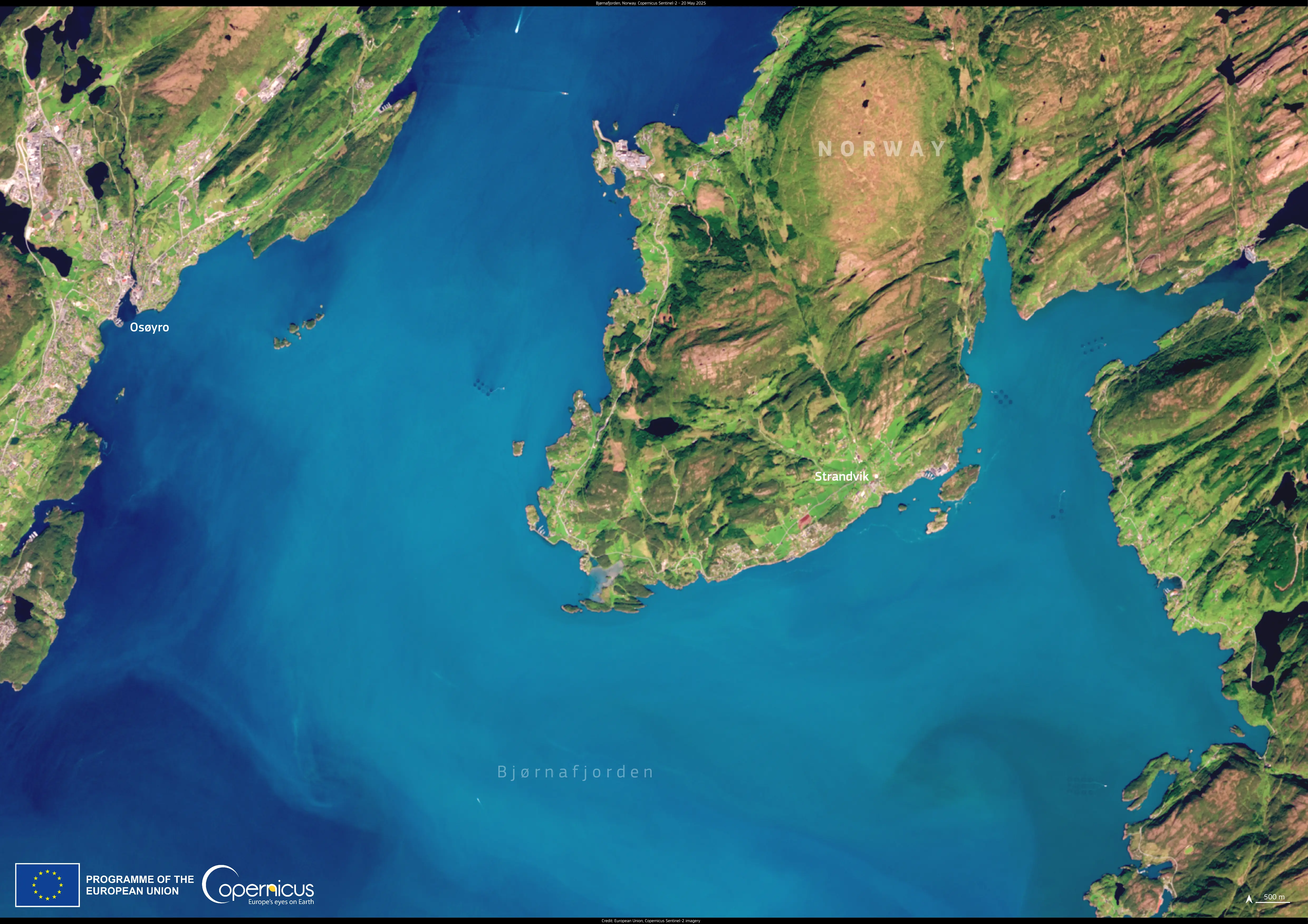 This cloud-free image, acquired by one of the Copernicus Sentinel-2 satellites on 20 May 2025, shows part of the fjord from above. The administrative centre of the Bjørnafjorden municipality, Osøyro, as well as the coastal village of Strandvik are visible.