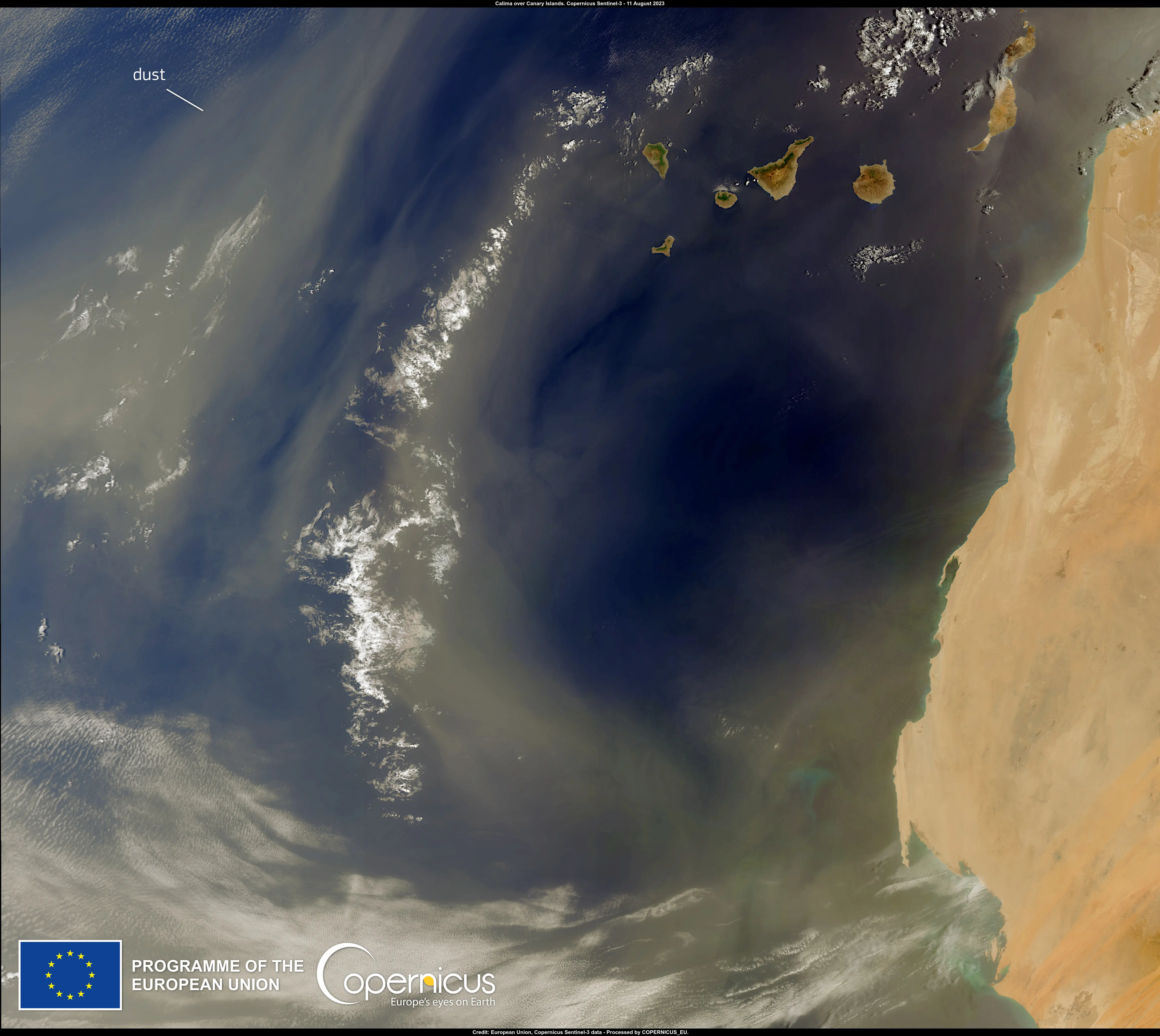 On the same day, the air quality was also affected. As illustrated in this image acquired by one of the Copernicus Sentinel-3 satellites, a Saharan dust storm, commonly referred to as "calima," engulfed the skies of the Islands.