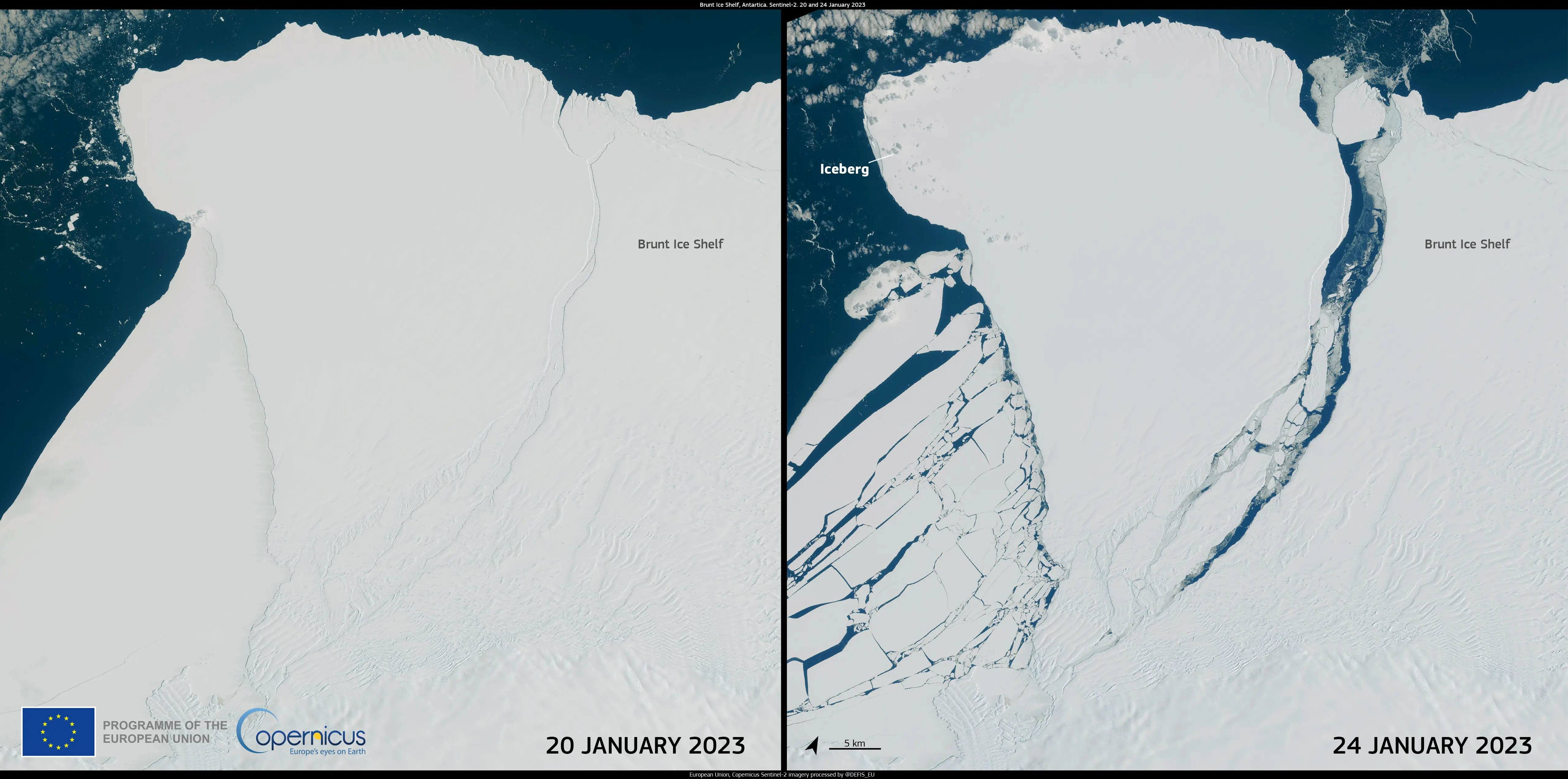 On 23 January, a massive iceberg, of 1,550 km2 (close to the size of the island of Gran Canaria or of Greater London), has calved from the Brunt Ice Shelf in Antarctica. This image was acquired on 20 and 24 January by one of the Copernicus Sentinel-2 satellites and shows the newly formed iceberg, named Chasm1, floating in the Weddell Sea.