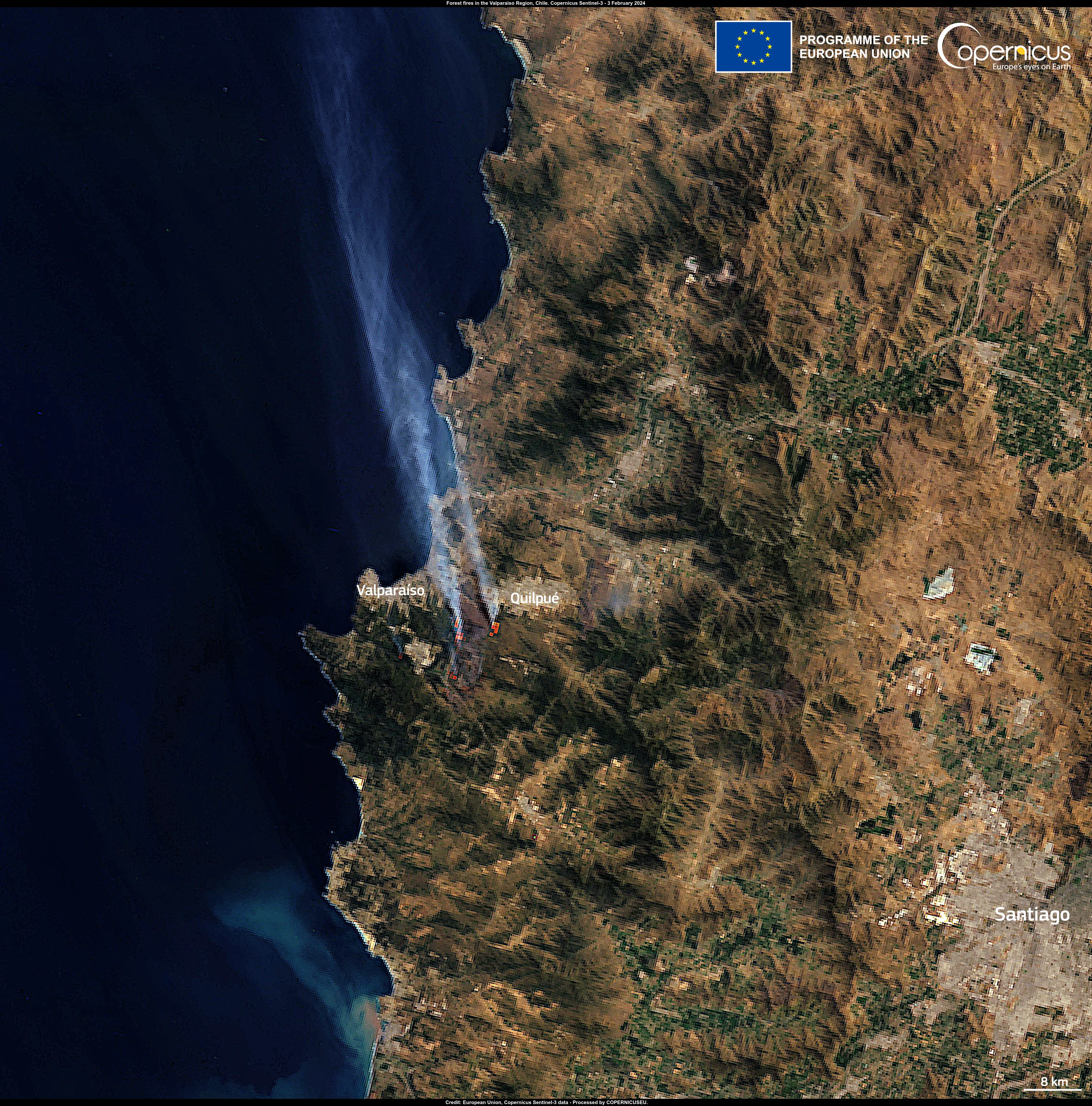 This image of Chile, acquired by one of the Copernicus Sentinel-3 satellites on 3 February 2024, shows the smoke cloud generated by the wildfires in the area between Valparaíso and Quilpué.