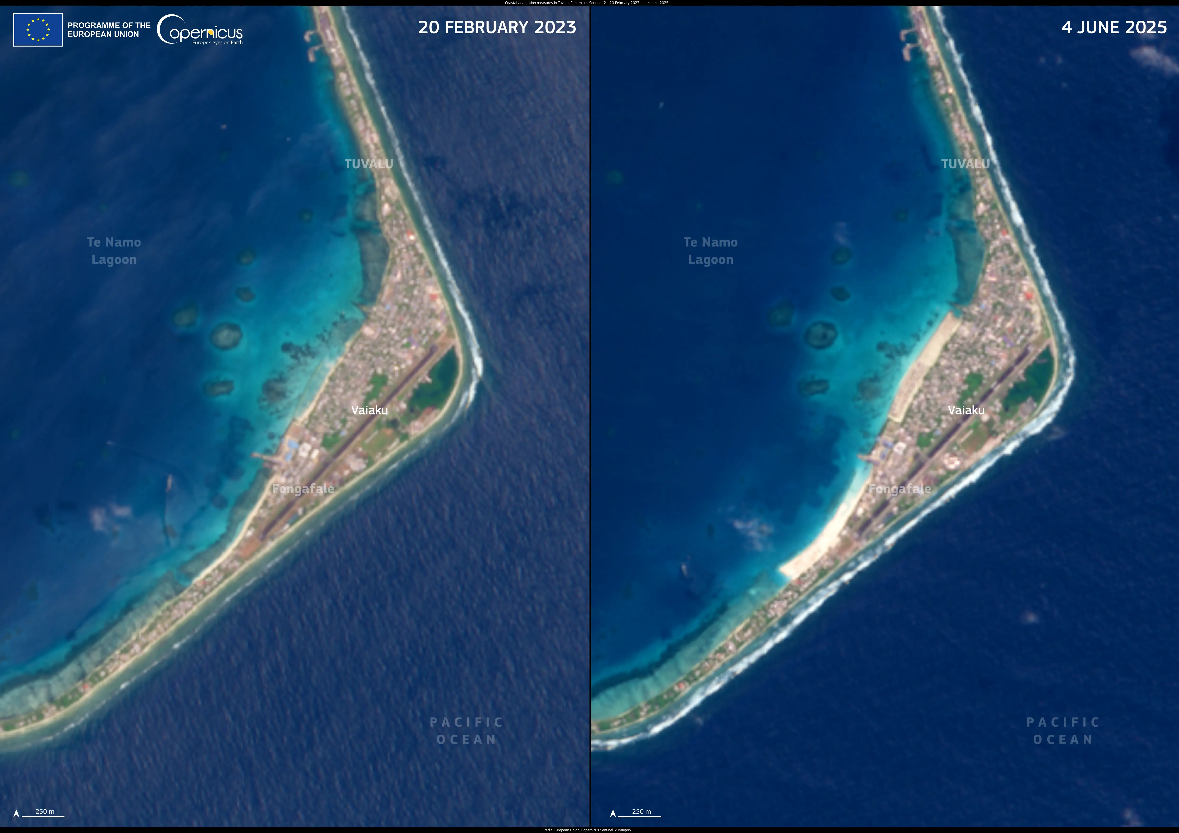 These Copernicus Sentinel-2 image, acquired on 20 February 2023 and 4 June 2025, show newly constructed buffers on Fongafale, Funafuti’s largest islet, which are designed to mitigate the effects of coastal erosion.