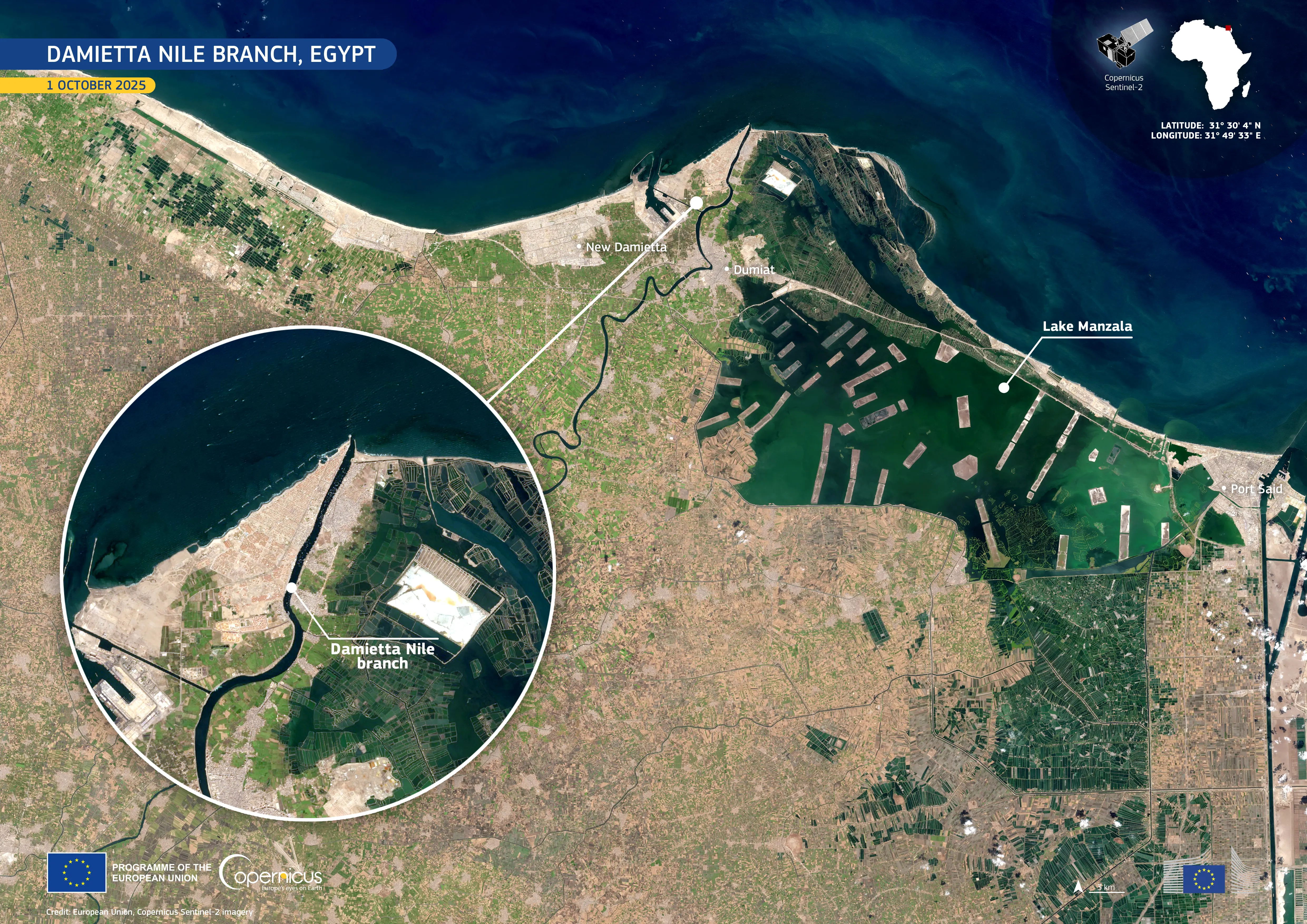 At the northeastern edge of Egypt’s Nile Delta, the Damietta branch of the Nile flows towards the Mediterranean Sea, crossing a region of significant ecological and economic importance. This area encompasses fertile agricultural land, expanding urban centres, and sensitive coastal and wetland ecosystems.
