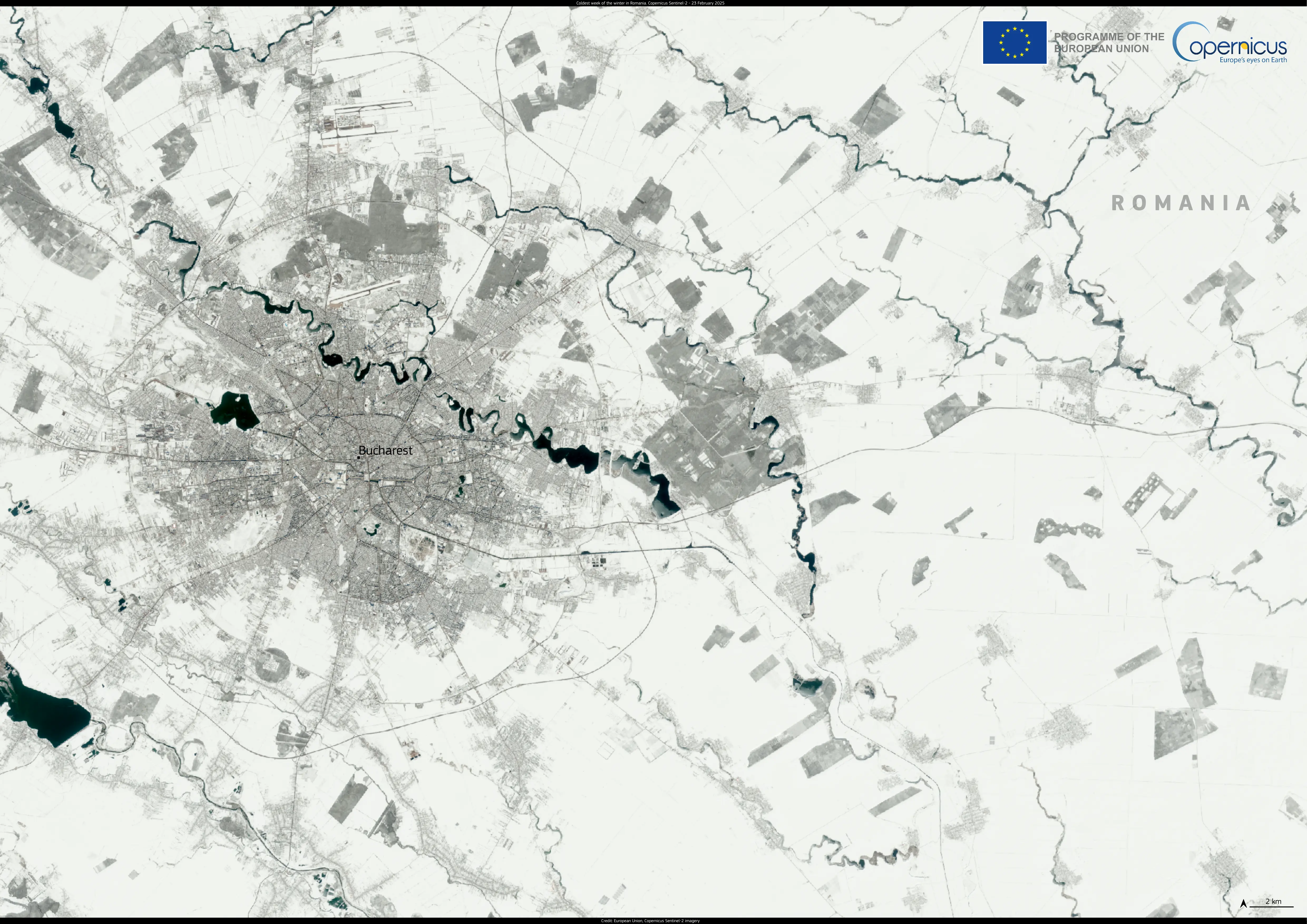 Bucharest is visible blanketed in snow in this image acquired by one of the Copernicus Sentinel-2 satellites on 23 February 2025.