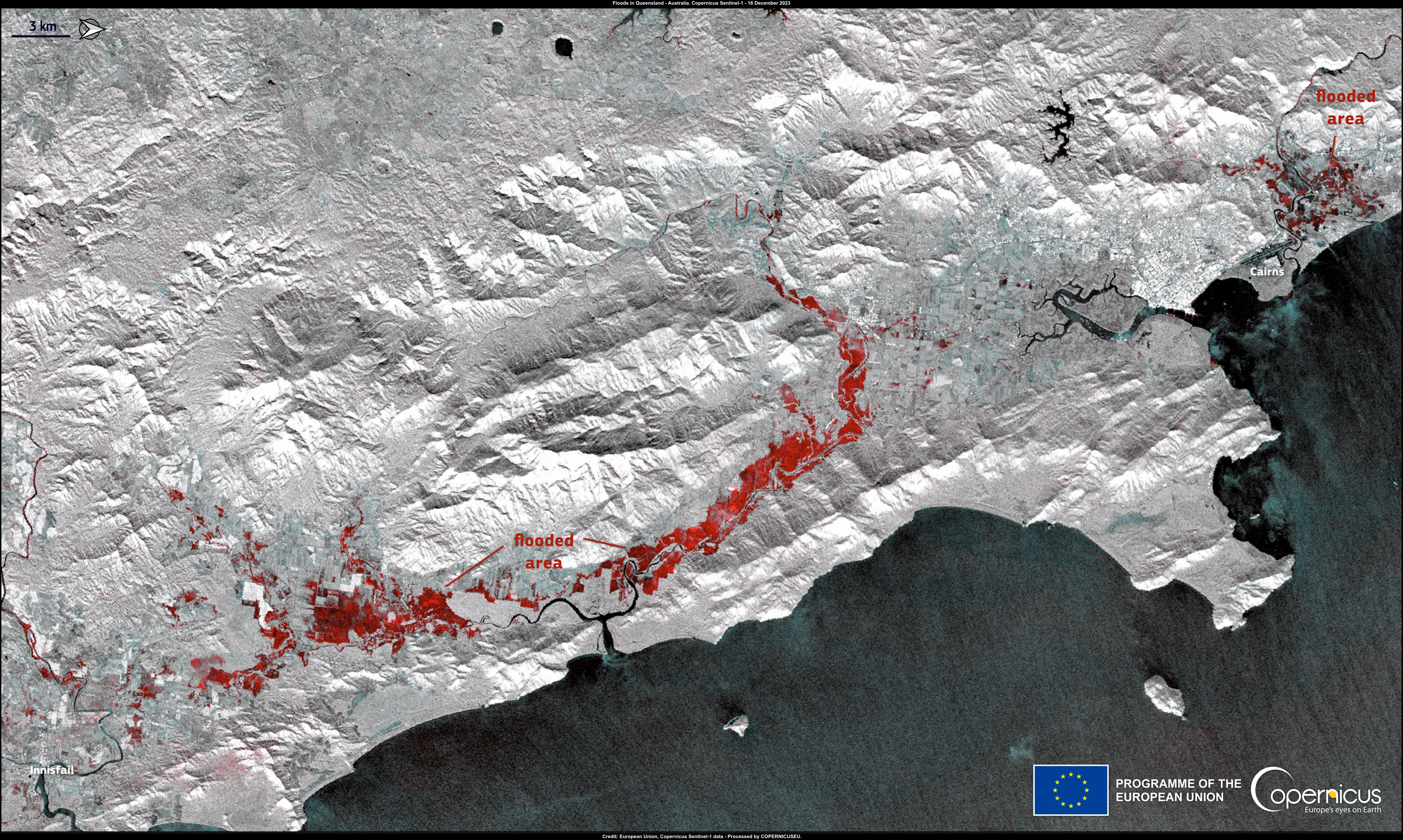The flooded areas south of Cairns are visible in this image acquired by the Copernicus Sentinel-1A satellite on 16 December.
