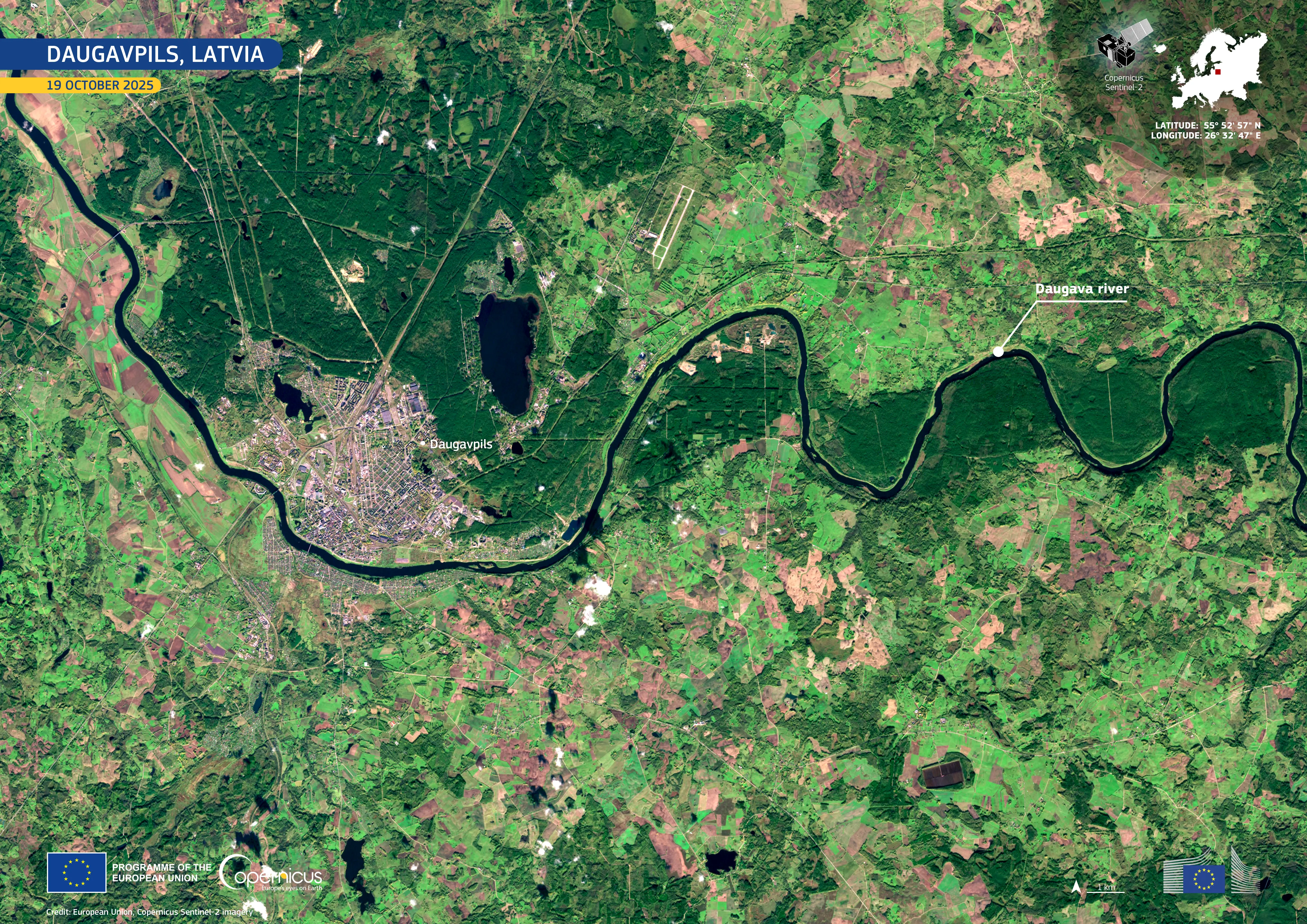 This Copernicus Sentinel-2 image, acquired on 19 October 2025, shows Daugavpils and the Daugava meandering through it. Water appears in dark blue to black, forested areas in dark green, and surrounding farmland in lighter green and brown tones.