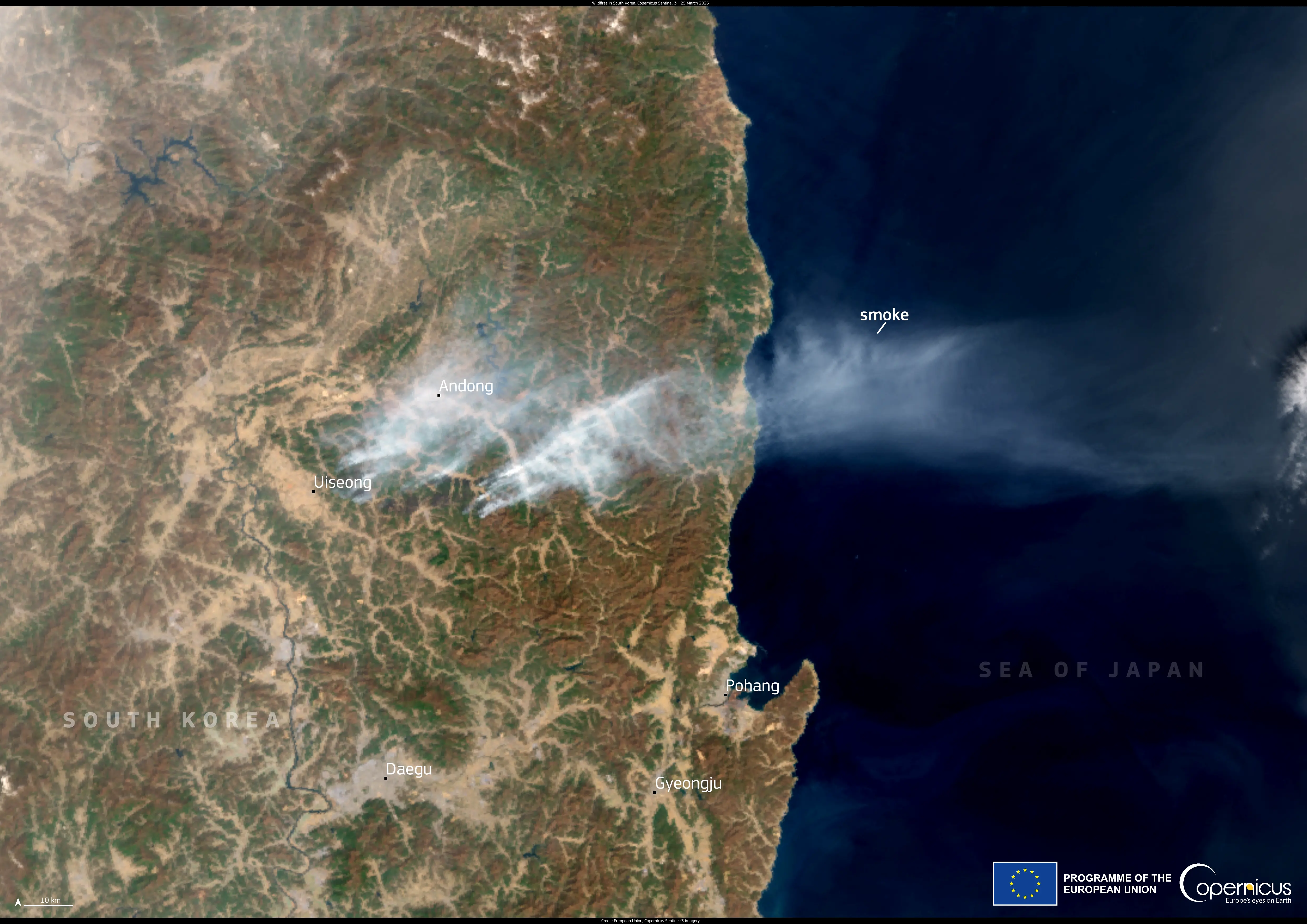 Thick smoke drifting over the Sea of Japan is visible in this Copernicus Sentinel-3 image acquired on 25 March 2025.