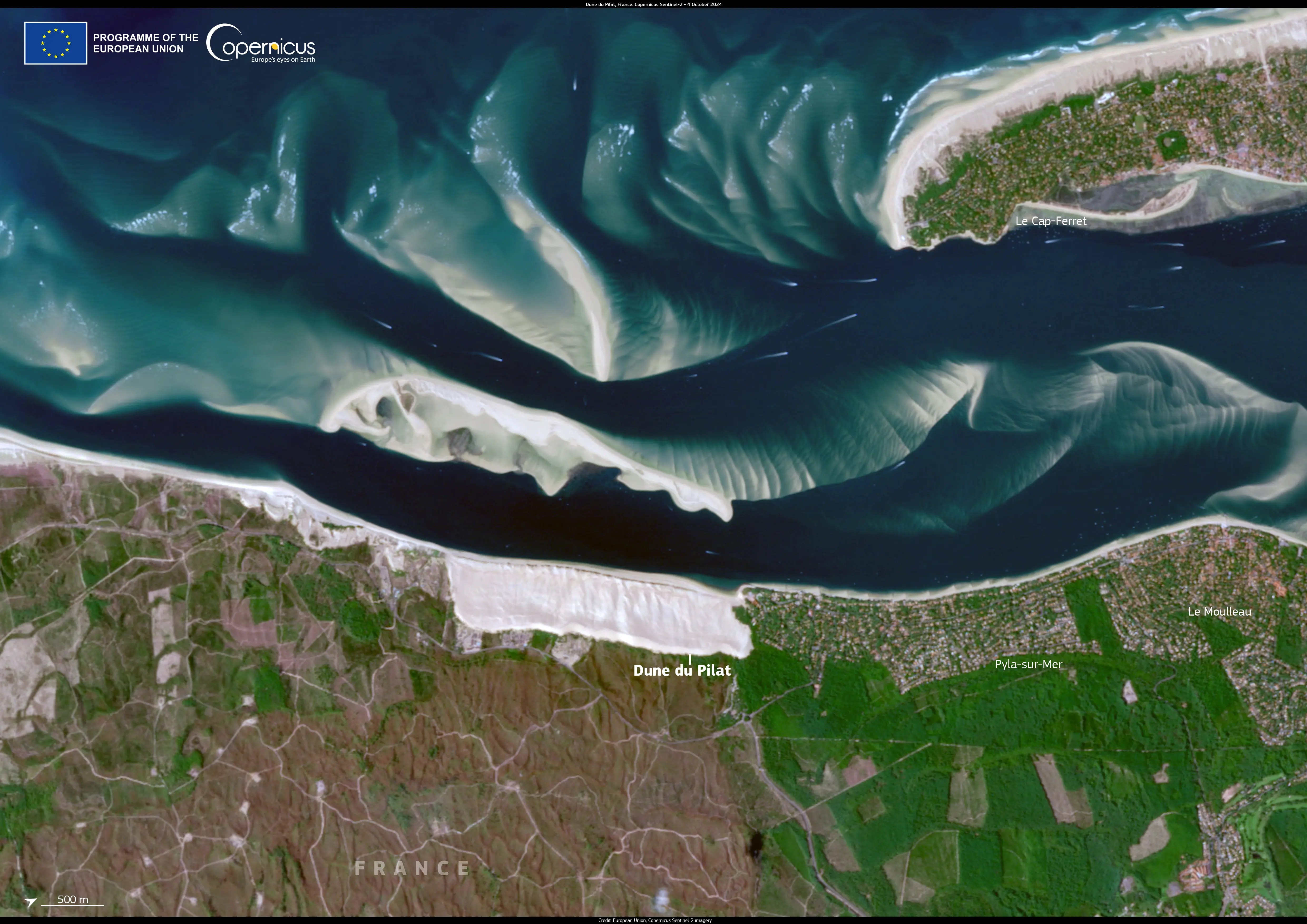 In this image acquired by one of the Copernicus Sentinel-2 satellites on 4 October 2024, Dune du Pilat is visible, stretching approximately 2.7 kilometres along the French Atlantic coast. Towards the top of the image, the Cap Ferret peninsula can be seen.