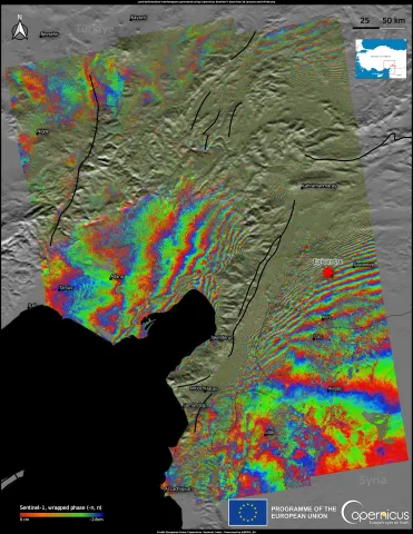 The earthquake was so strong that it caused massive ground deformations. This interferogram was created using the radar data acquired by the Copernicus Sentinel-1 satellite in ascending orbit on 28 January and 9 February.