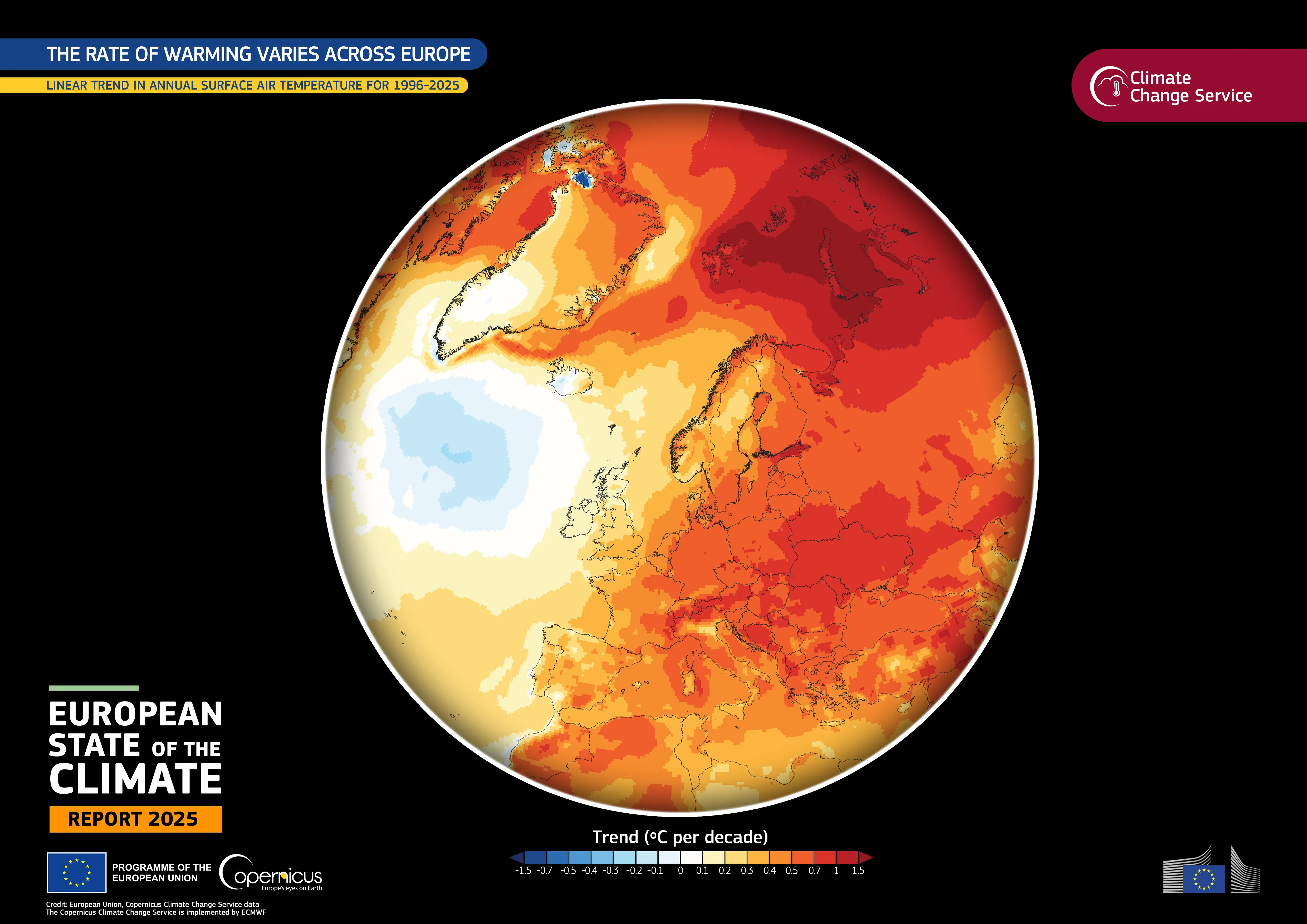 This data visualisation, based on Copernicus Climate Change Service data, provides insights into warming trends across Europe. The fastest warming regions are observed in northern high latitudes, particularly the Arctic, as well as in central and eastern Europe. The Arctic region, shown in dark red, is the fastest-warming region on Earth, with temperatures increasing by around 0.75°C per decade since the mid-1990s. An area of cooling over the North Atlantic indicates a decreasing temperature trend, which has mitigated warming in Iceland since around 2011.