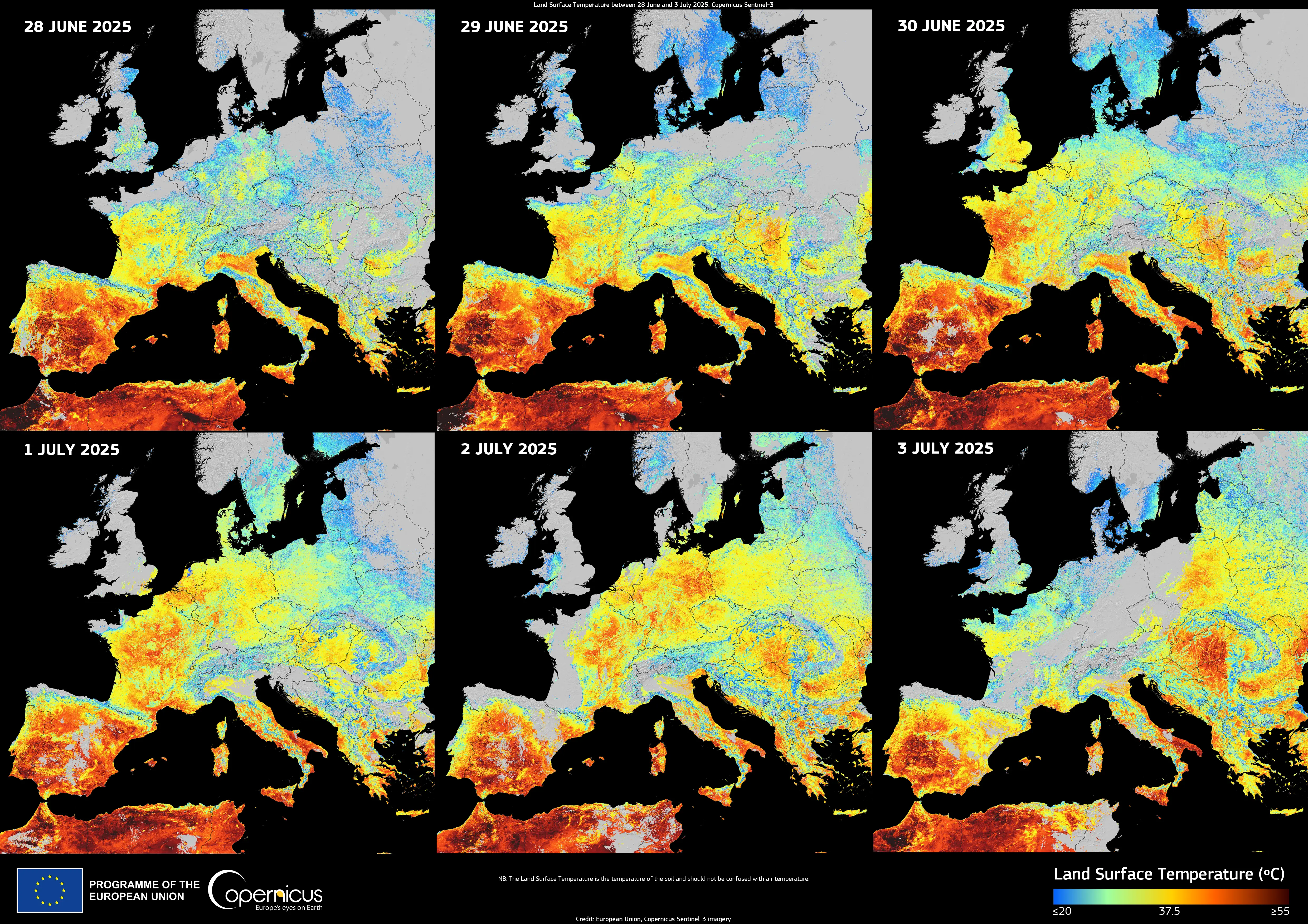This data visualisation is derived from measurements from the Copernicus Sentinel-3 Sea and Land Surface Temperature Radiometer (SLSTR) instrument. It shows the daily Land Surface Temperature (LST) across Europe from 28 June to 3 July 2025.