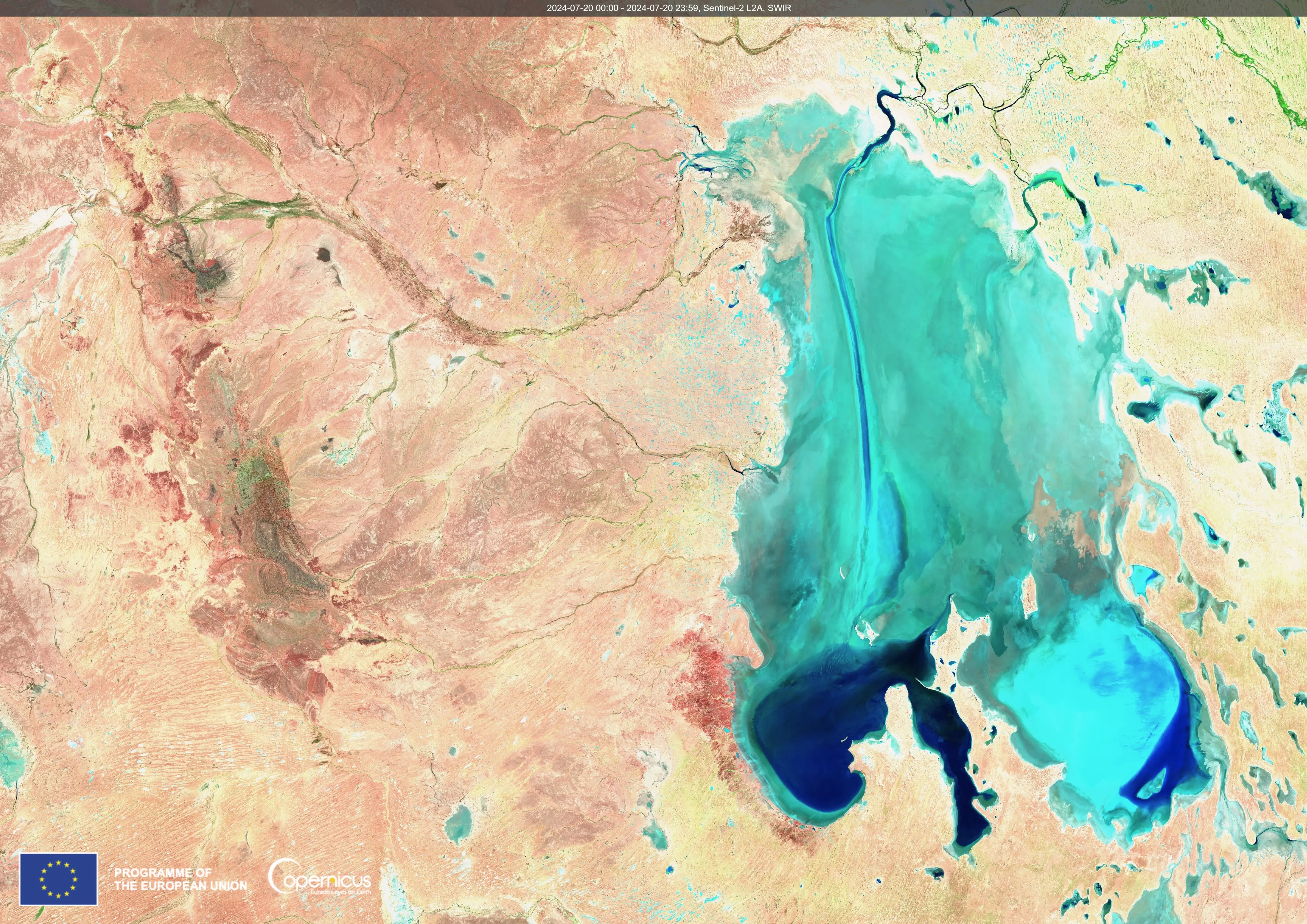 On July 20, 2024, Copernicus Sentinel-2 captured the full size of the lake. This scene is a short-wave infrared composite. We can discern vegetation in green, water in deep blue and dry salt surfaces in turquoise.