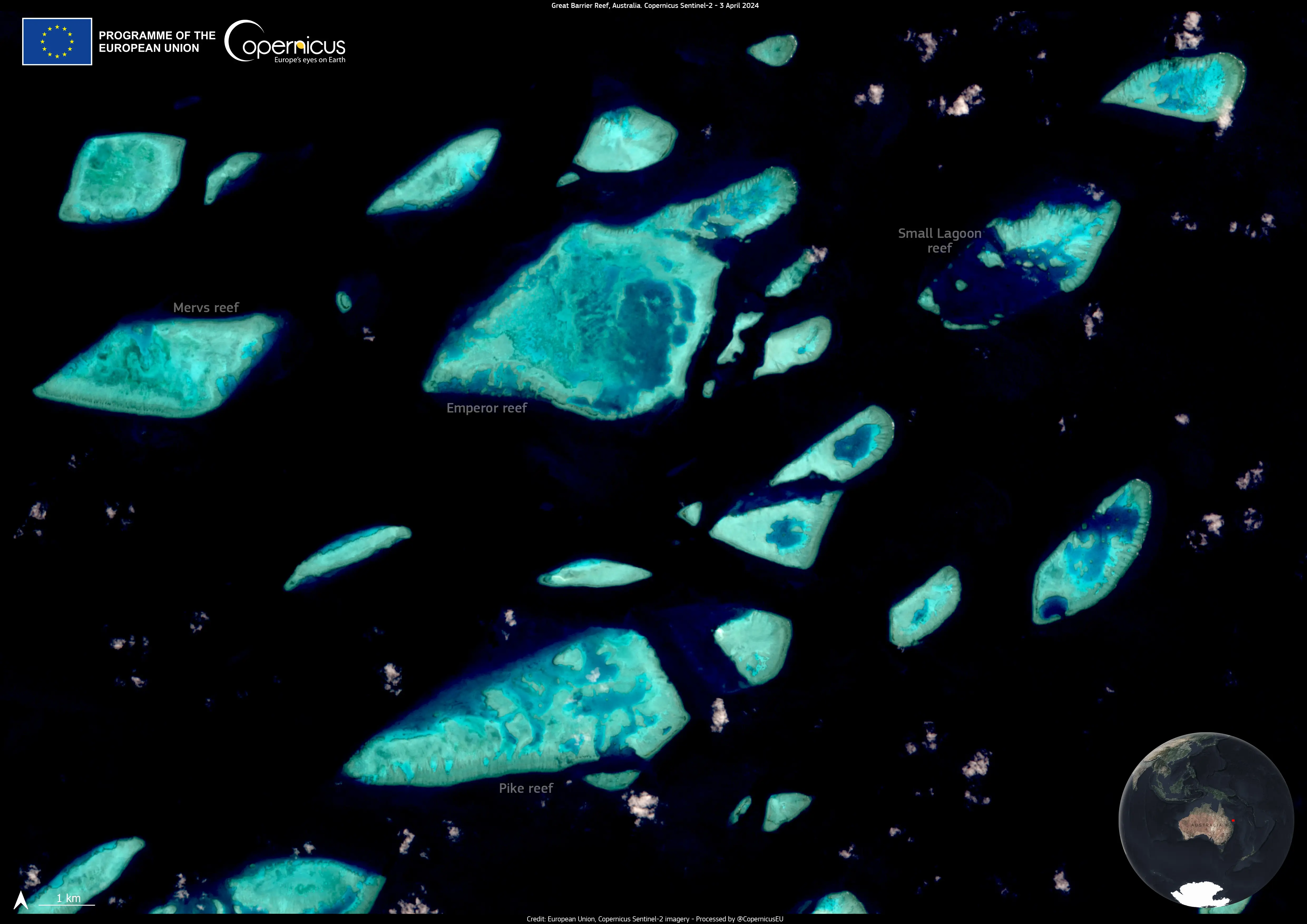 The coral atolls off the coast of Queensland, one of the worst affected areas, are visible in this Copernicus Sentinel-2 image acquired on 3 April.