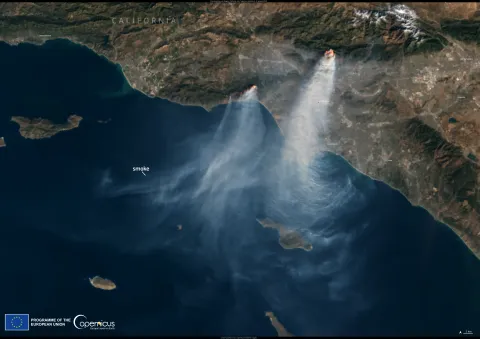 Wildfires burning in Los Angeles are visible in this Copernicus Sentinel-3 image acquired on 9 January 2025.