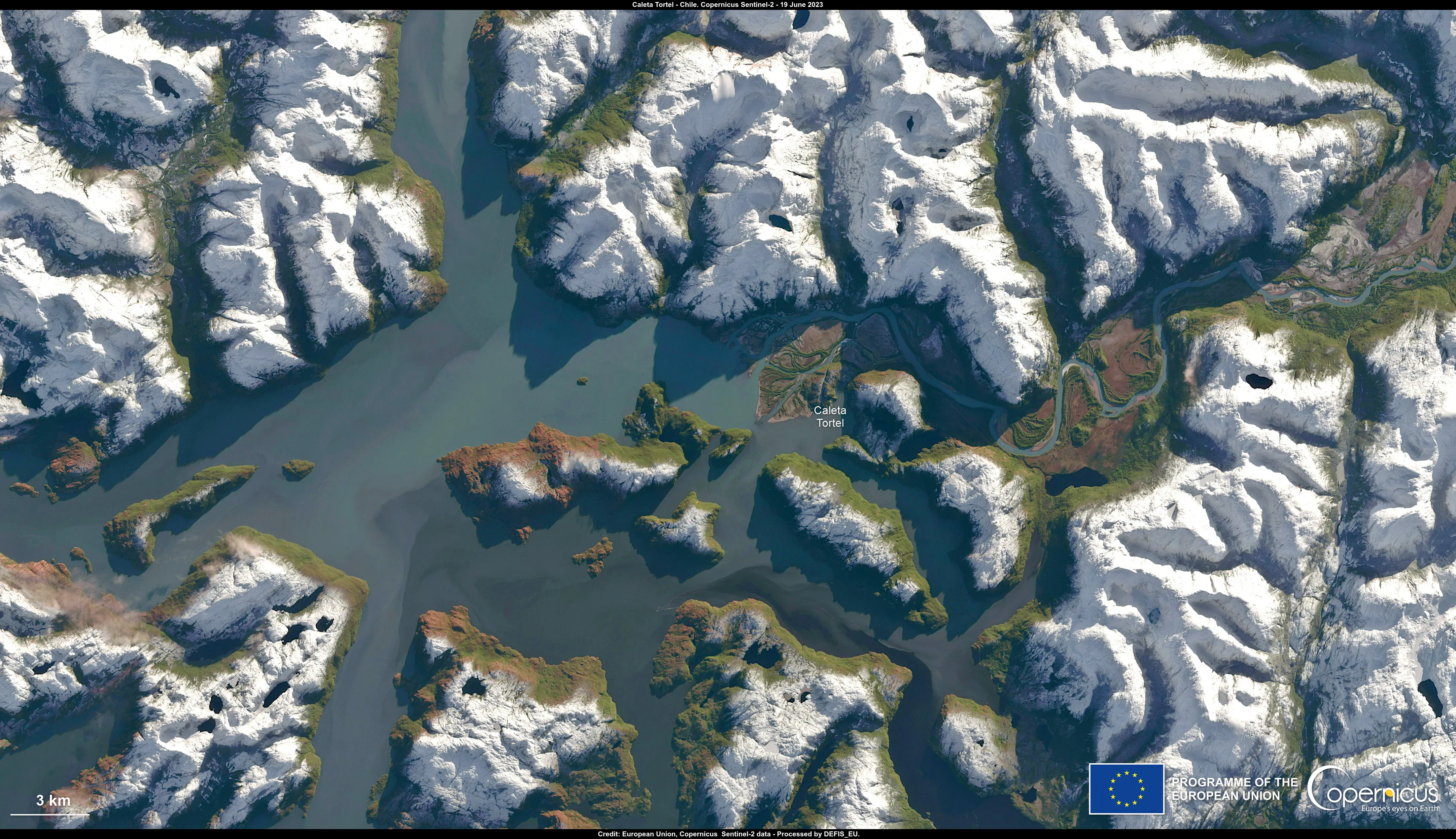 This image, captured by one of Copernicus Sentinel-2 satellites on 19 June, shows the snow-capped peaks of the Caleta Tortel Coastal Marine Protected Area in Chilean Patagonia. Tortel is surrounded by breathtaking landscapes characterised by glaciers, mountains, dense forests and fjords where meltwater, river water and seawater combine. The untouched nature and unique geographical features foster an incredible array of life.