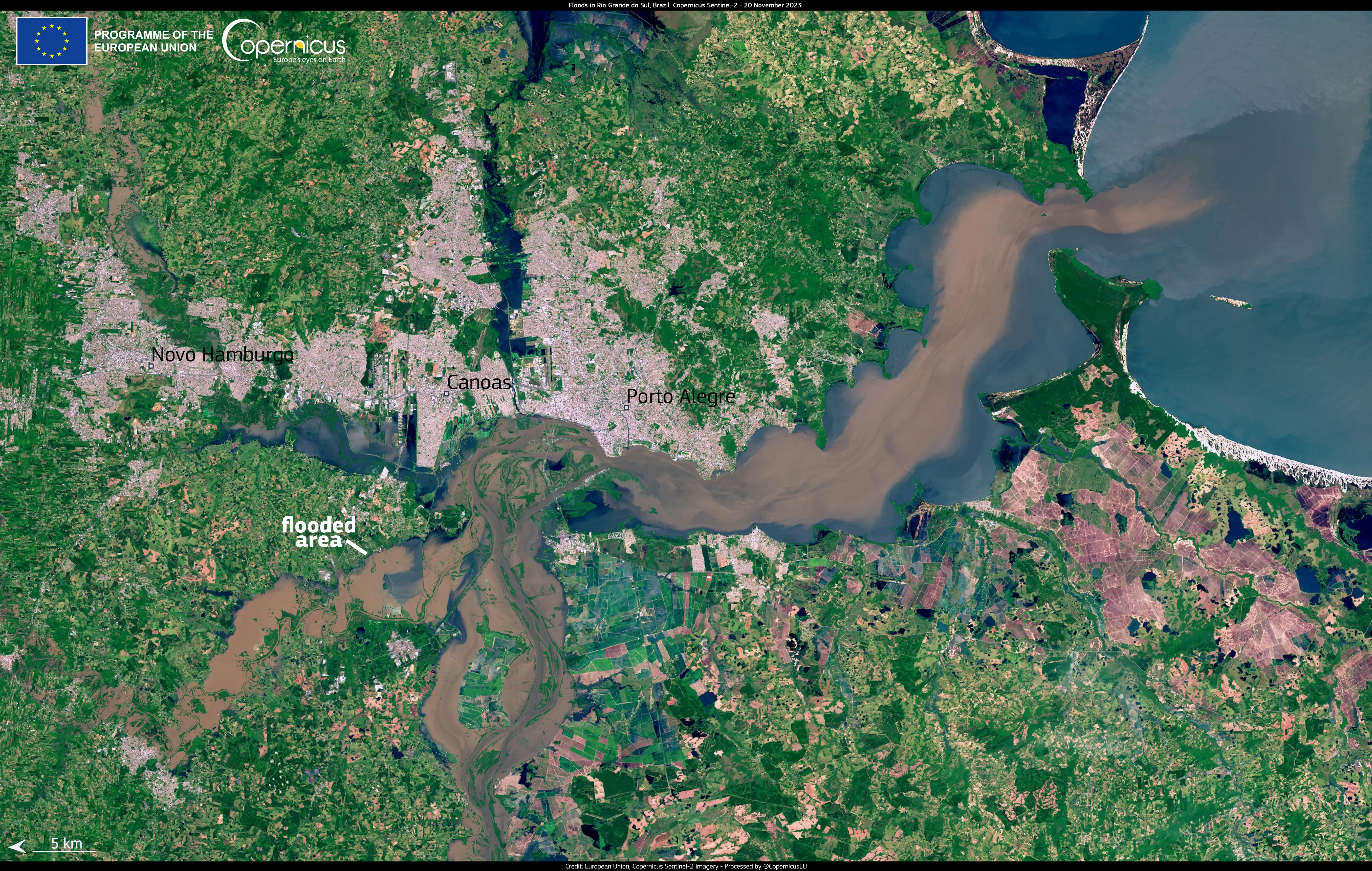 The flooded areas near the city of Porto Alegre are visible in this image acquired by one of the Copernicus Sentinel-2 satellites on 20 November.