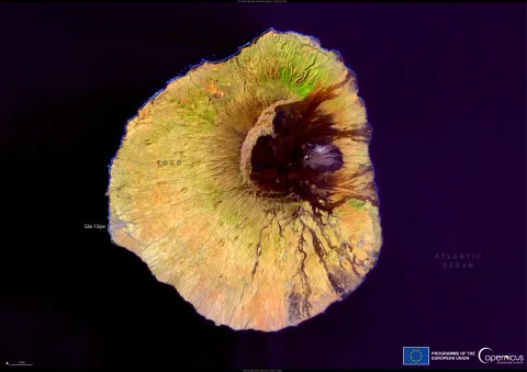 This Copernicus Sentinel-2 image, acquired on 24 February 2025, reveals Fogo’s striking topography and dark lava flows surrounding the central crater.