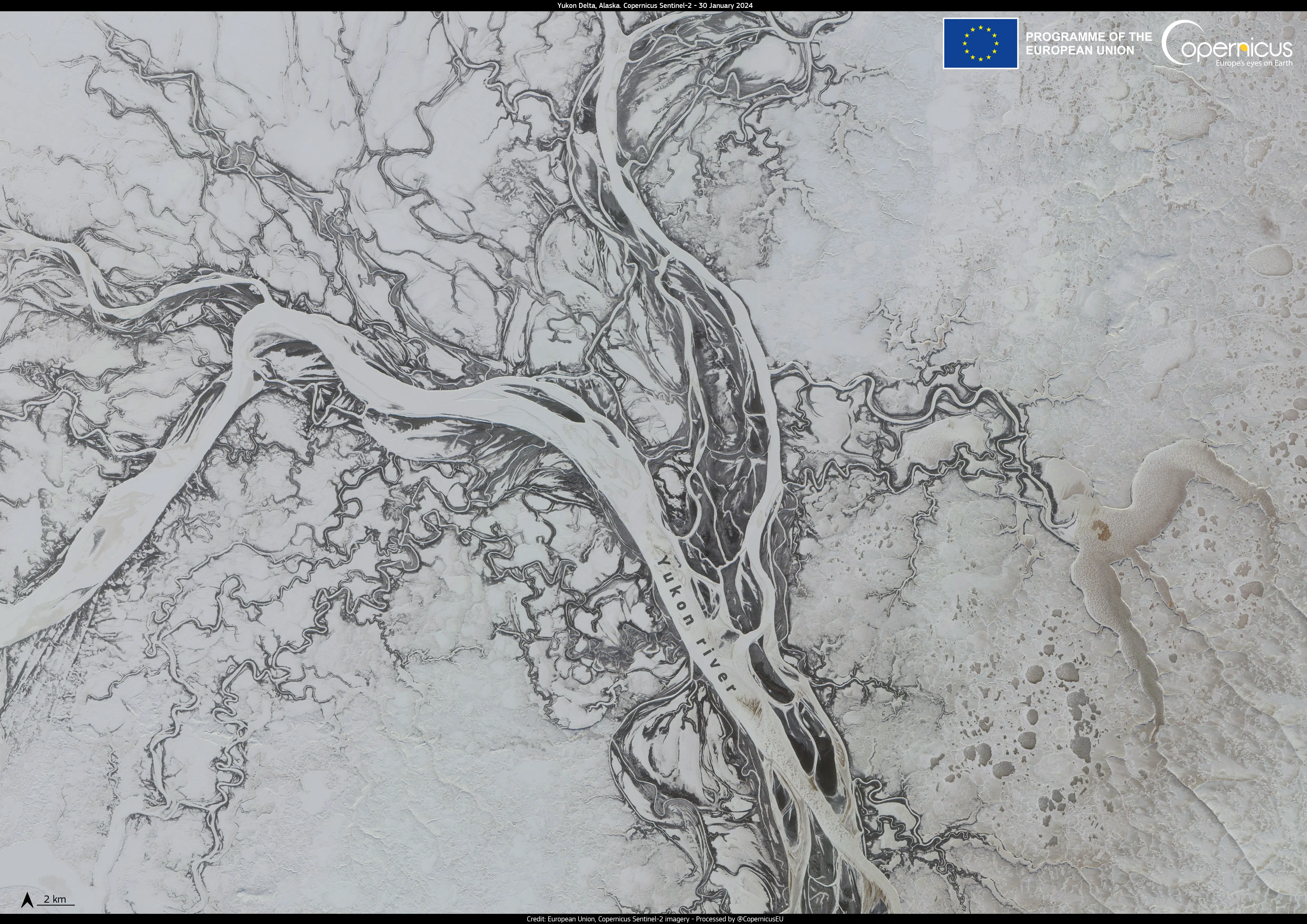 This image was acquired on 30 January 2024 and shows the Yukon River and its delta completely frozen.