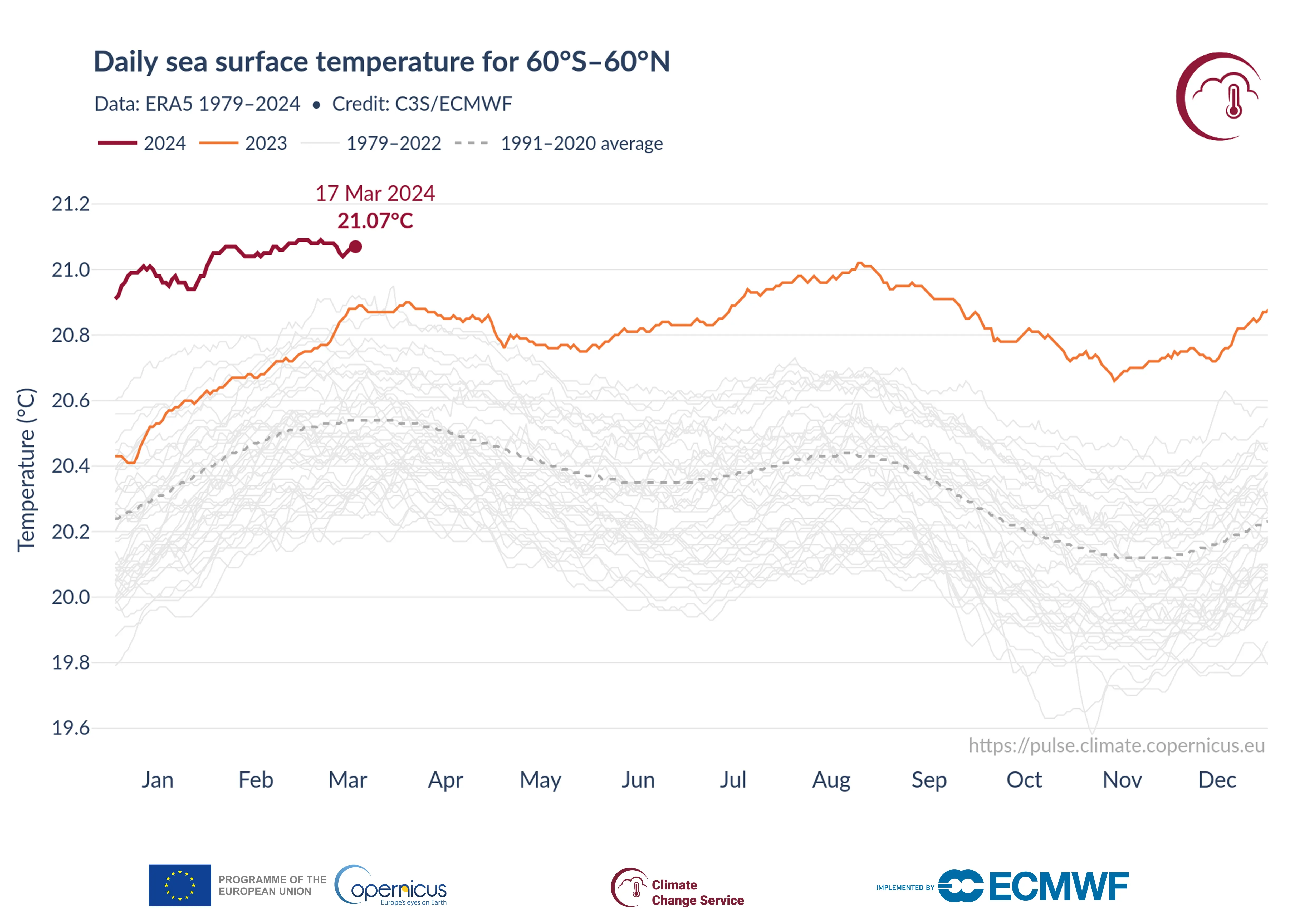 This data visualisation, based on the data of the Copernicus Climate Change Service, gives an overview of the evolution of daily Sea Surface Temperatures since 1979. It shows that daily average global Sea Surface Temperatures reached +21.07°C on 17 March.