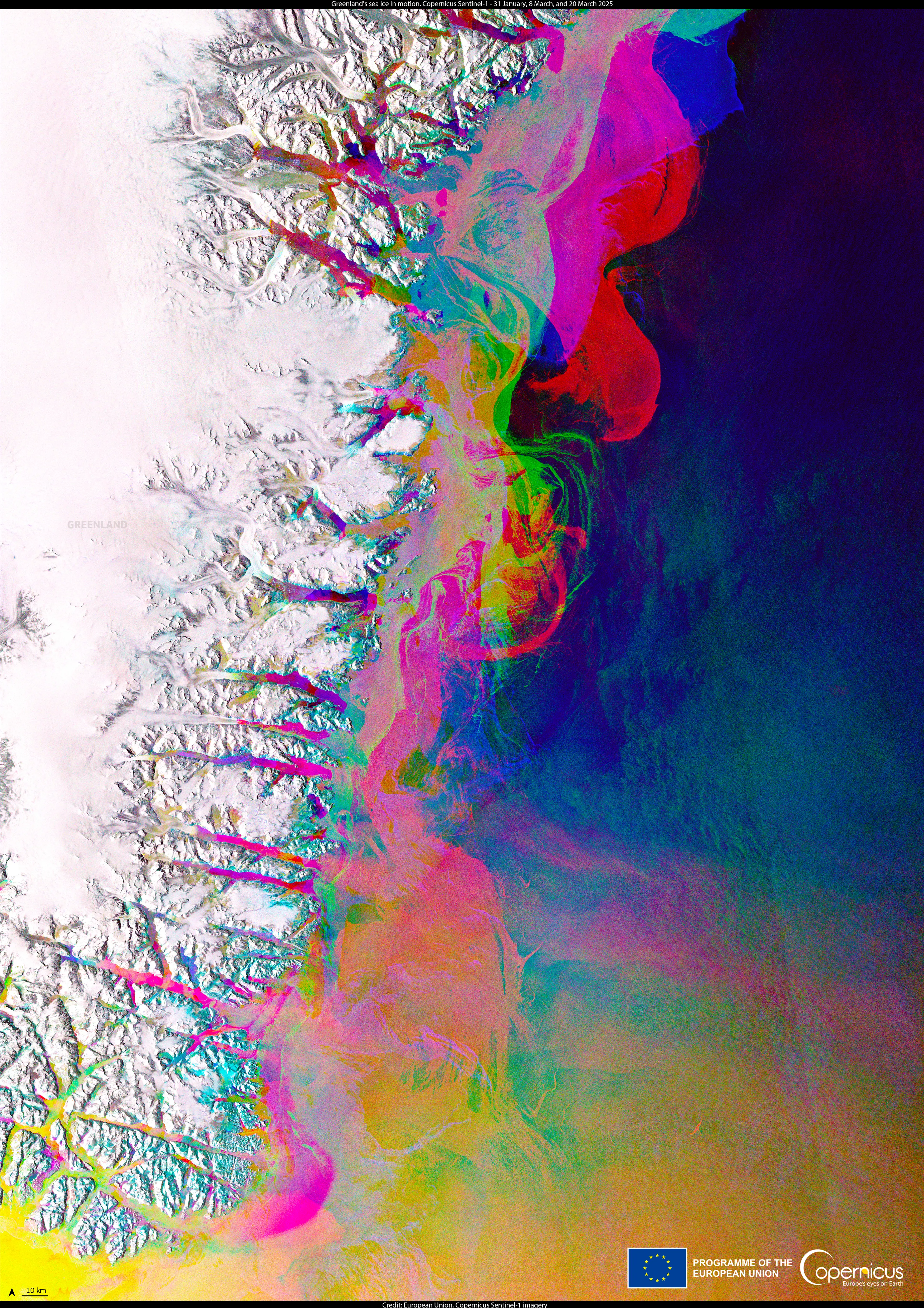 This striking composite image of Greenland’s south-eastern coast was created from three Copernicus Sentinel-1 radar acquisitions on 31 January, 8 March, and 20 March 2025.