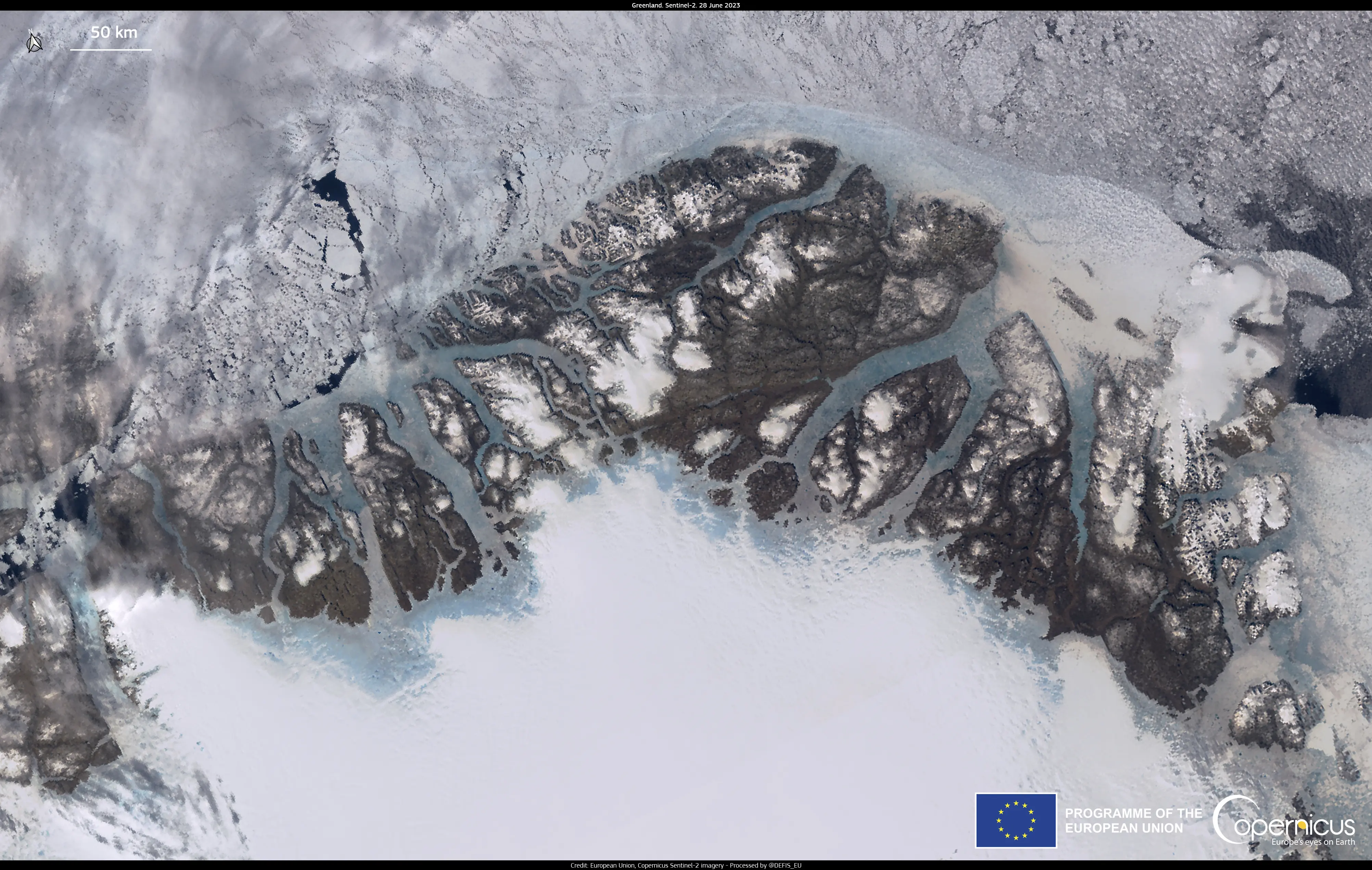 This image, acquired by one of the Copernicus Sentinel-3 satellites on 29 June 2023, shows melting ice trails in northern Greenland. A remarkable heatwave in Greenland is causing extensive melting conditions throughout the northern ice sheet.