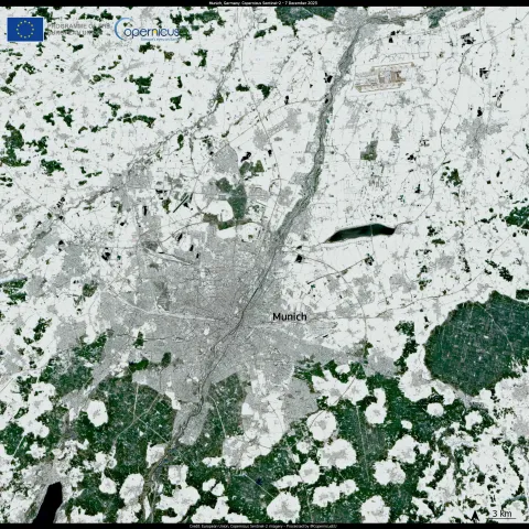 This image of Munich acquired by one of the Copernicus Sentinel-2 satellites on 7 December shows the massive amounts of snow that were still present around the city.