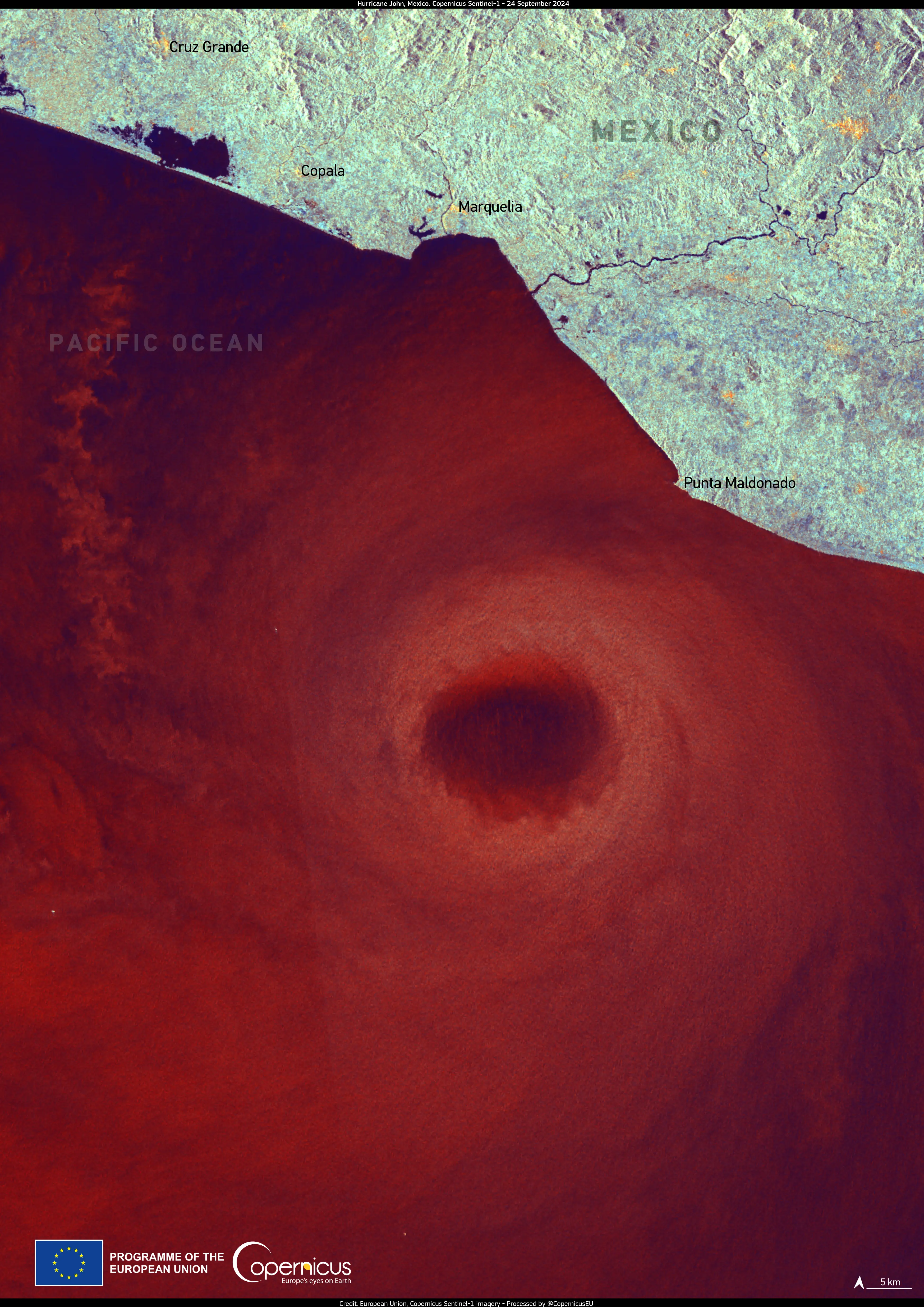 This Copernicus Sentinel-1 radar image of Hurricane John, acquired on 24 September 2024, shows the eye of the storm west of the Mexican town of Punta Maldonado.