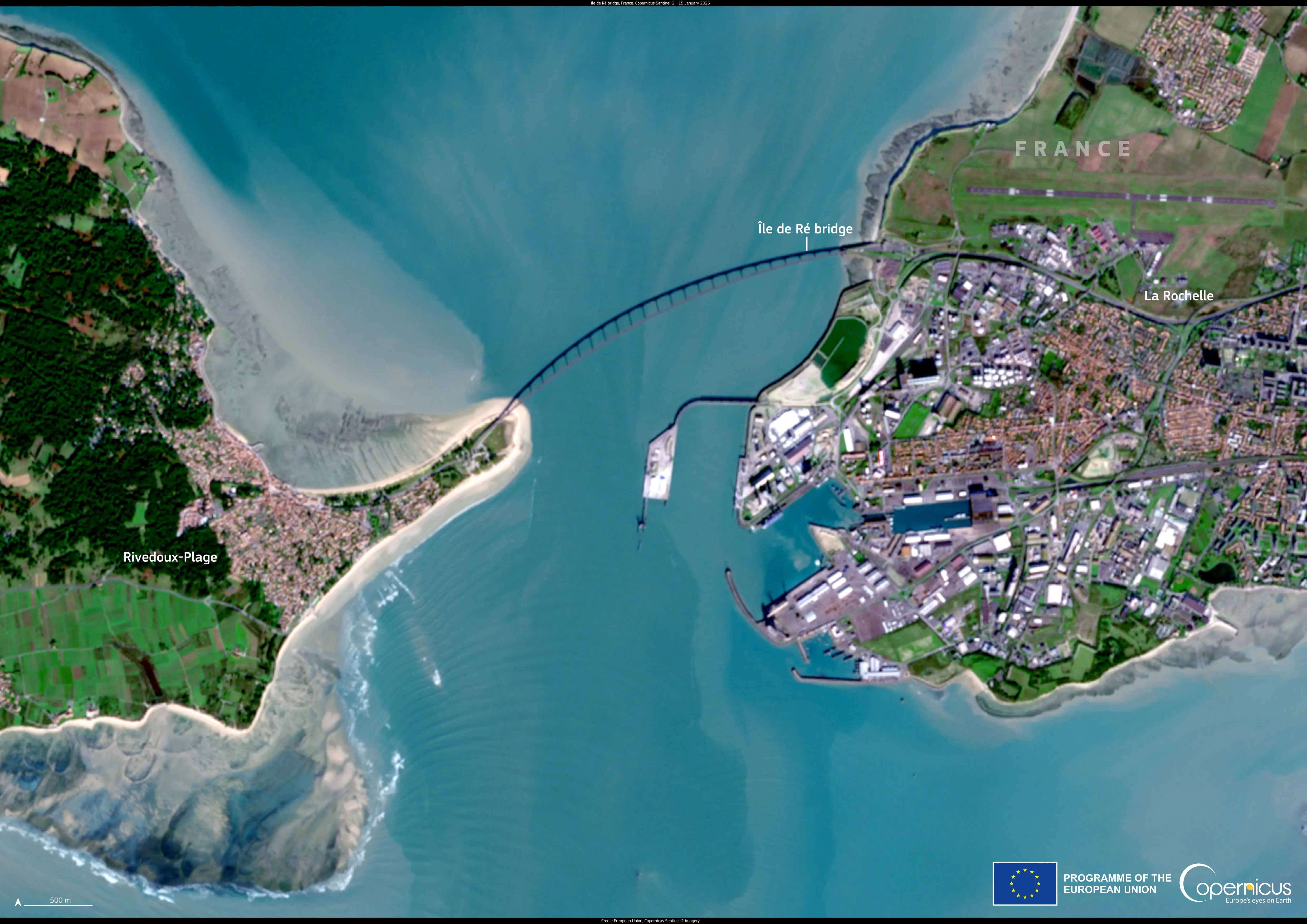 The Île de Ré Bridge is visible in this Copernicus Sentinel-2 image acquired on 15 January 2025.