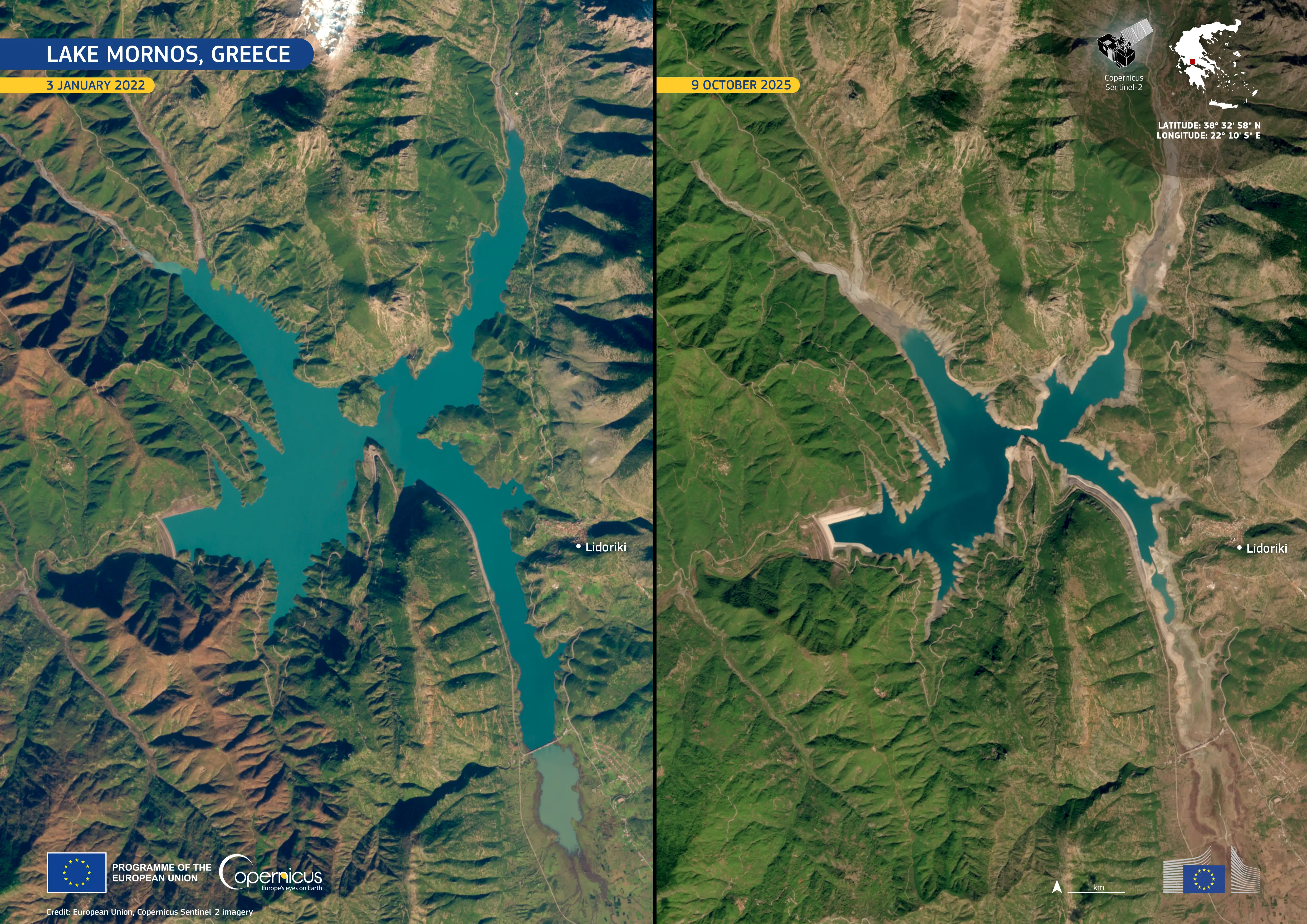 These Copernicus Sentinel-2 satellite images, acquired on 3 January 2022 and 9 October 2025, show the decrease in water volume in Lake Mornos over this period. The lake has visibly receded, revealing stretches of shoreline and lakebed.