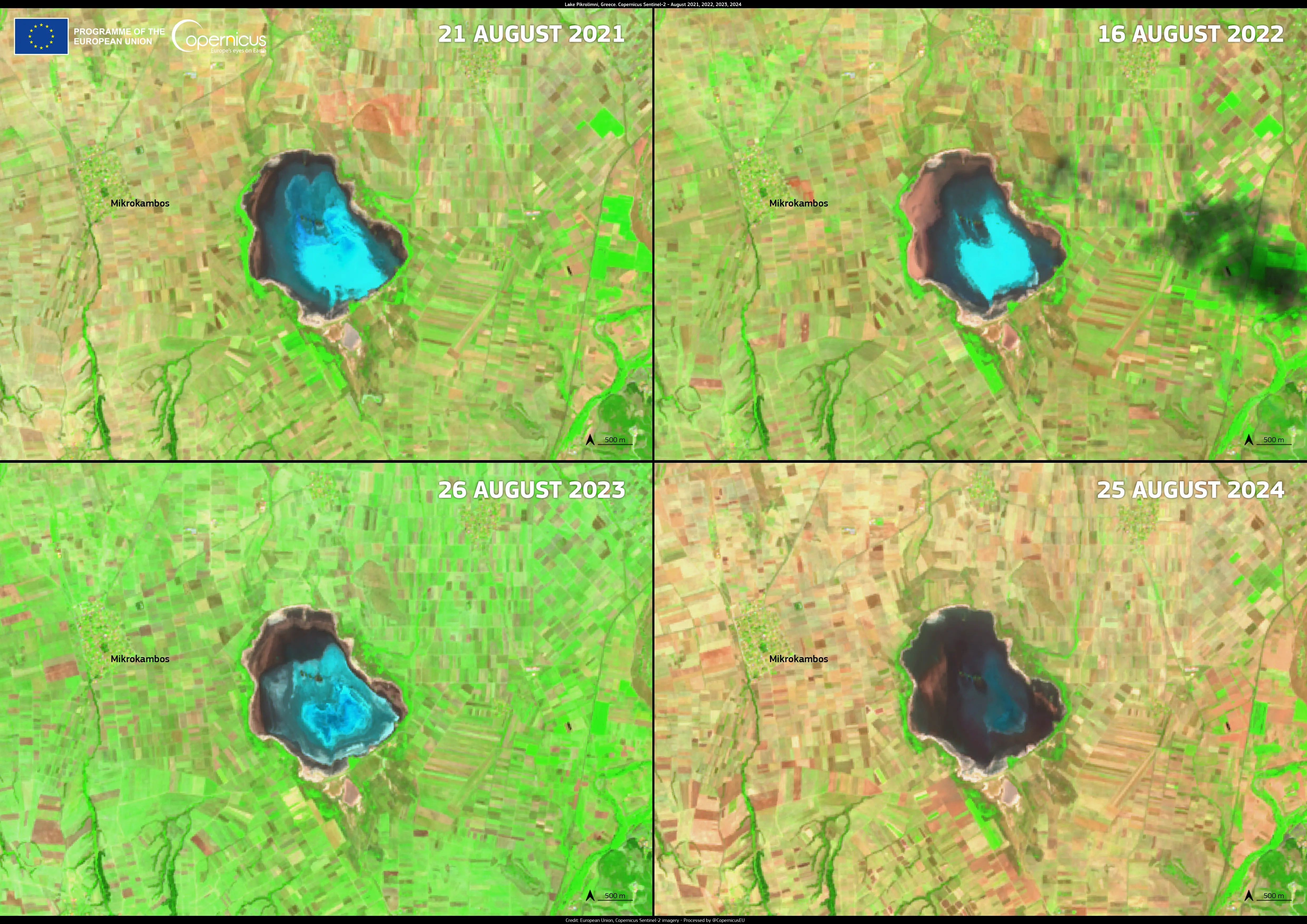 These images, acquired by the Copernicus Sentinel-2 satellites between August 2021 and August 2024, vividly illustrate the progressive drying of Lake Pikrolimni. Once known as a popular destination for therapeutic mud baths, the lake has now been transformed into cracked, dry land.