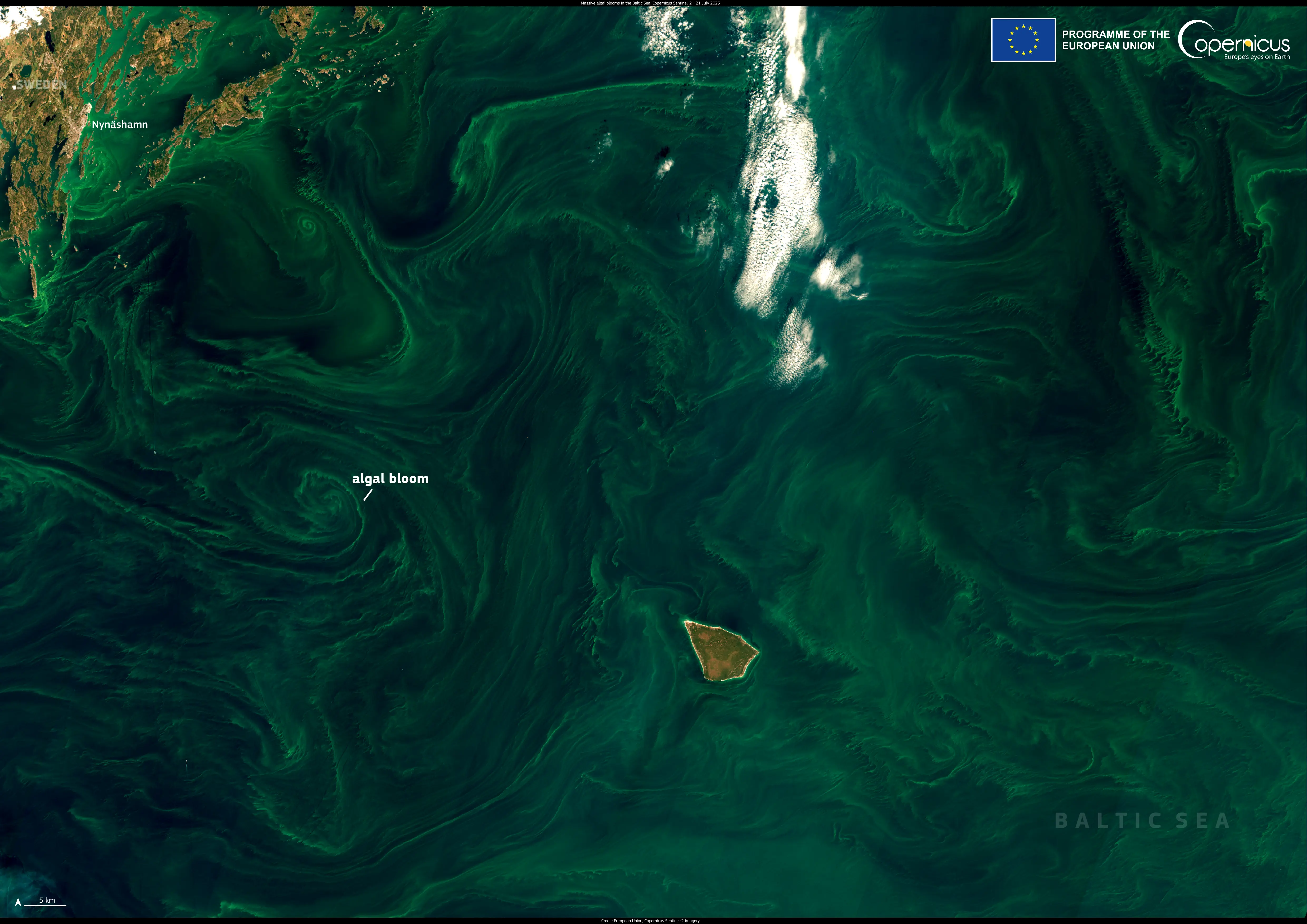 This image, acquired by a Copernicus Sentinel-2 satellite on 21 July 2025, shows widespread algal blooms off the coast of Sweden. The first signs of this event appeared in early July and have steadily intensified, fed by nutrient-rich runoff and a prolonged heatwave.