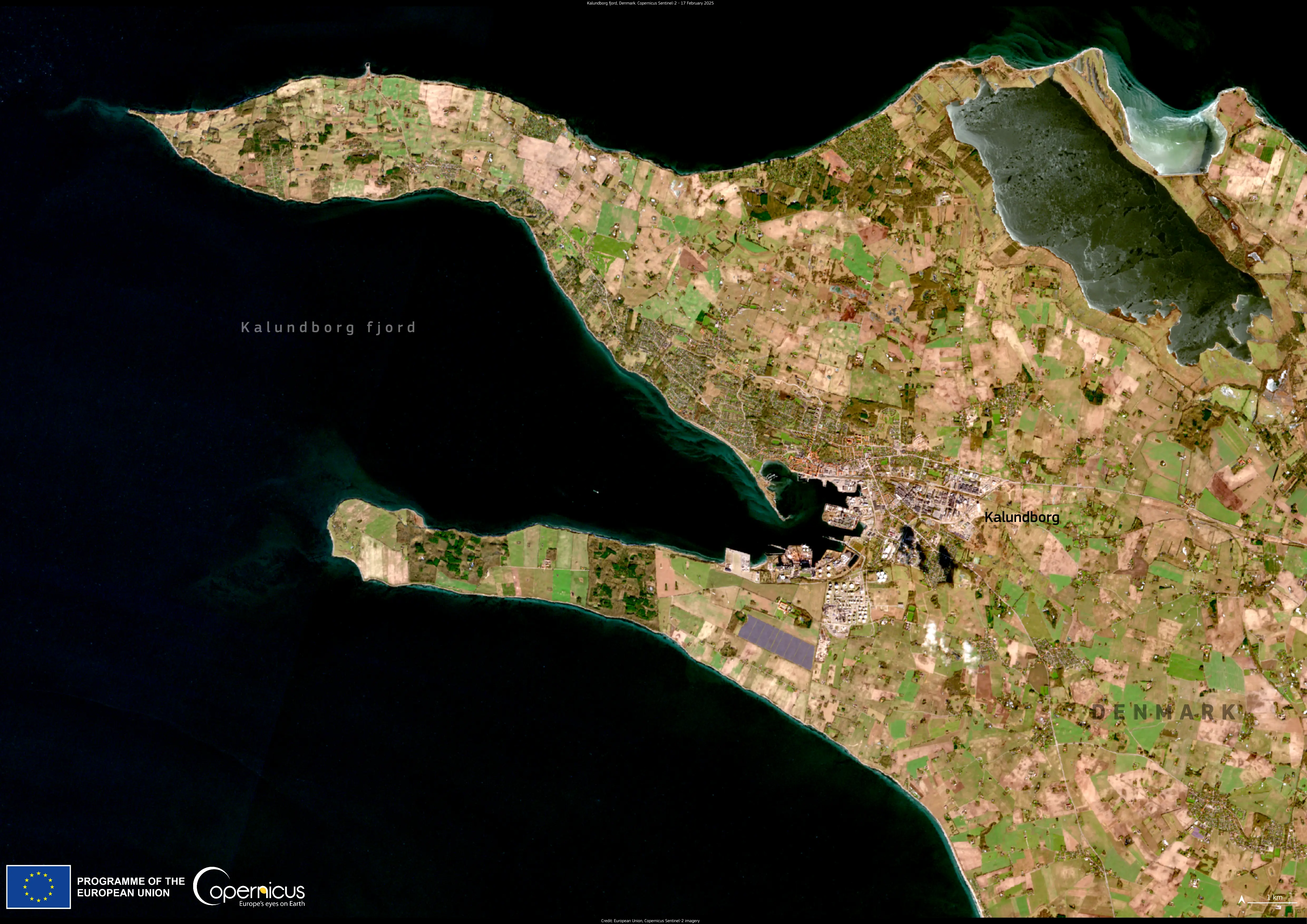 This Copernicus Sentinel-2 image, acquired on 17 February 2025, shows the city of Kalundborg and its nearby fjord.
