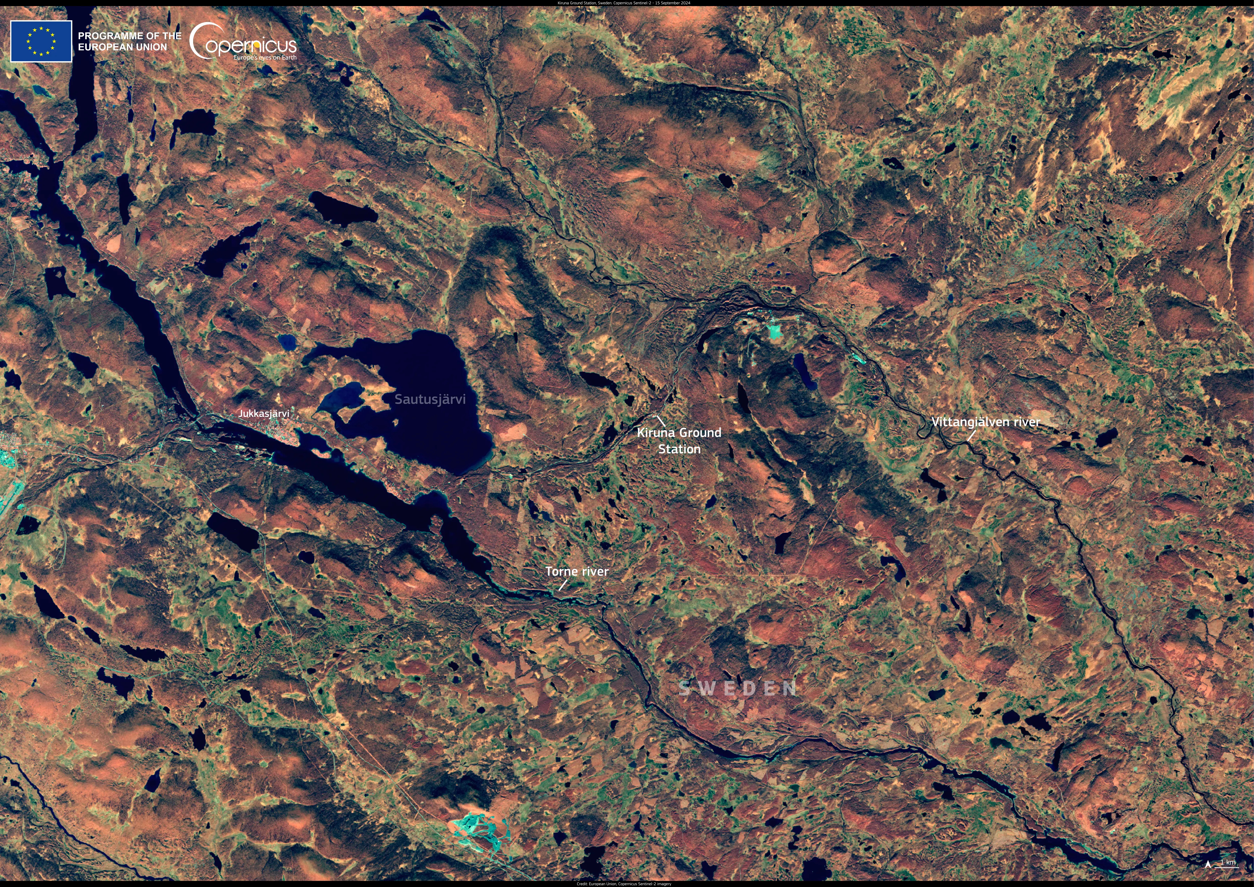 This image, acquired by one of the Copernicus Sentinel-2 satellites on 15 September 2024, shows Kiruna Ground Station in the centre, surrounded by the Vittangiälven and Torne rivers on either side. To the west, the Sautusjärvi lake and the village of Jukkasjärvi are visible.