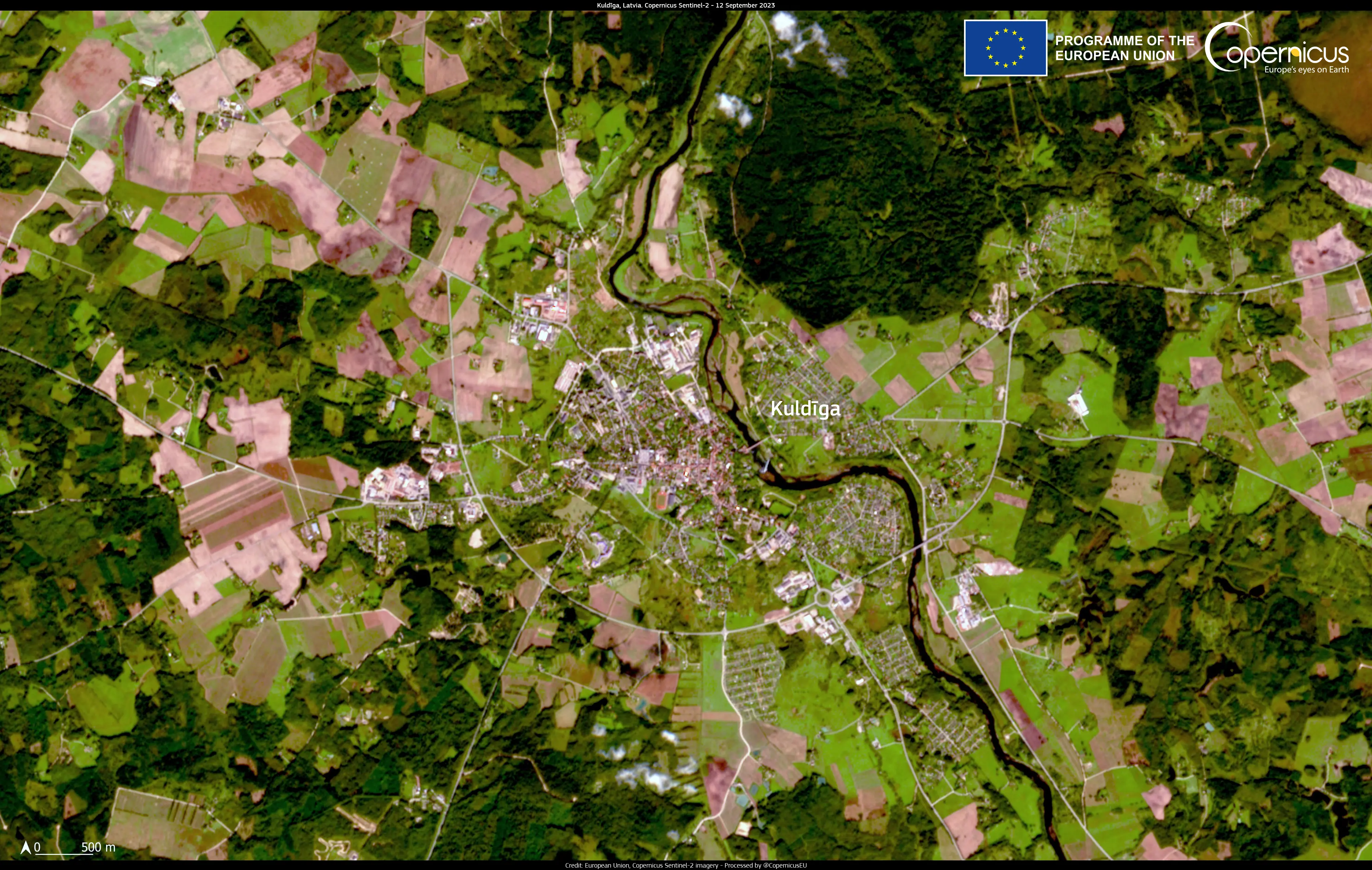 Among them is Kludïga, visible in this Copernicus Sentinel-2 image acquired on 12 September. Kludïga is a town in western Latvia on the banks of the Aleksupite river. Located in one of the greener countries in Europe, Kludïga is often nicknamed the “Venice of Latvia” and known for the Venta waterfall, the widest in Europe. This medieval city, an important administrative centre between the 16th and 18th centuries, has preserved the same street layout for centuries.
