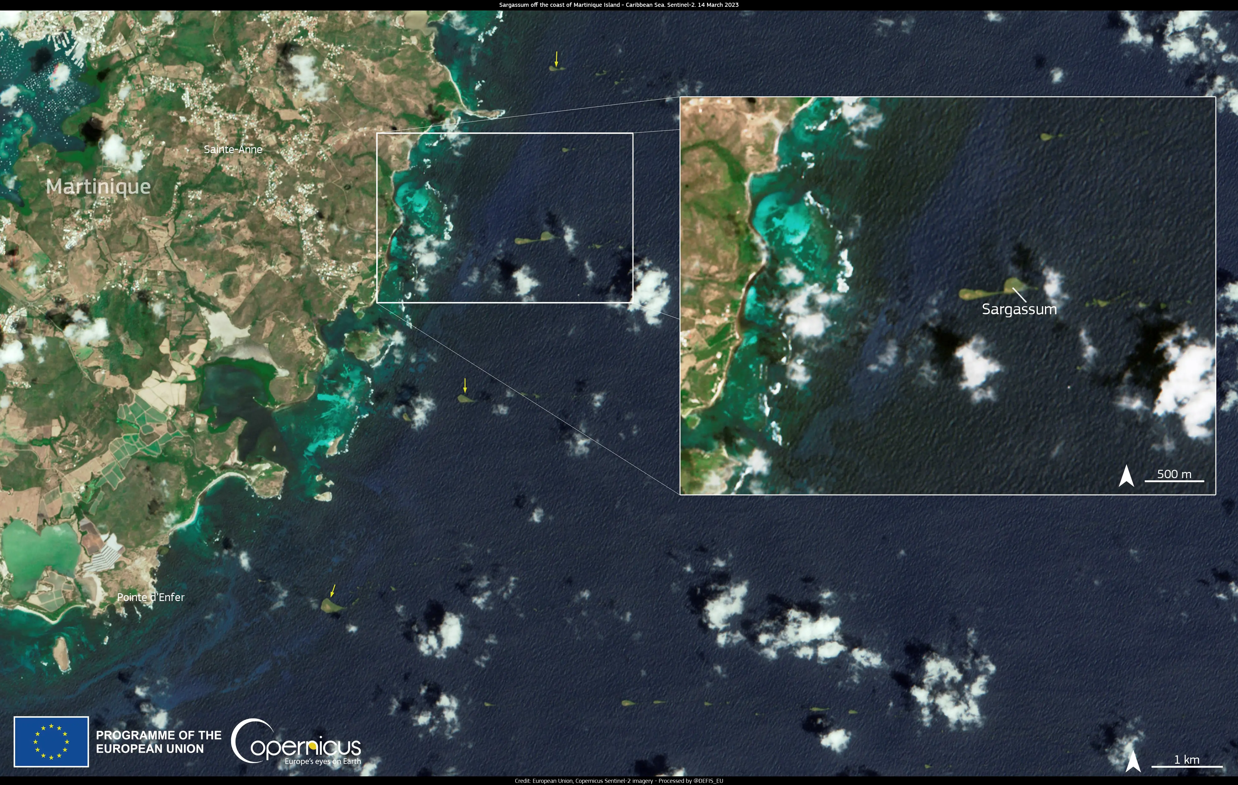This image, acquired on 14 March by one of the Copernicus Sentinel-2 satellites, captures banks of sargassum floating off the coast of the French island of Martinique in the Caribbean Sea. Sargassum is a brown seaweed commonly found in the Atlantic Ocean. However, the largest bloom in years began in early 2023 and has affected many coastlines in the region, causing damage to the tourism industry.