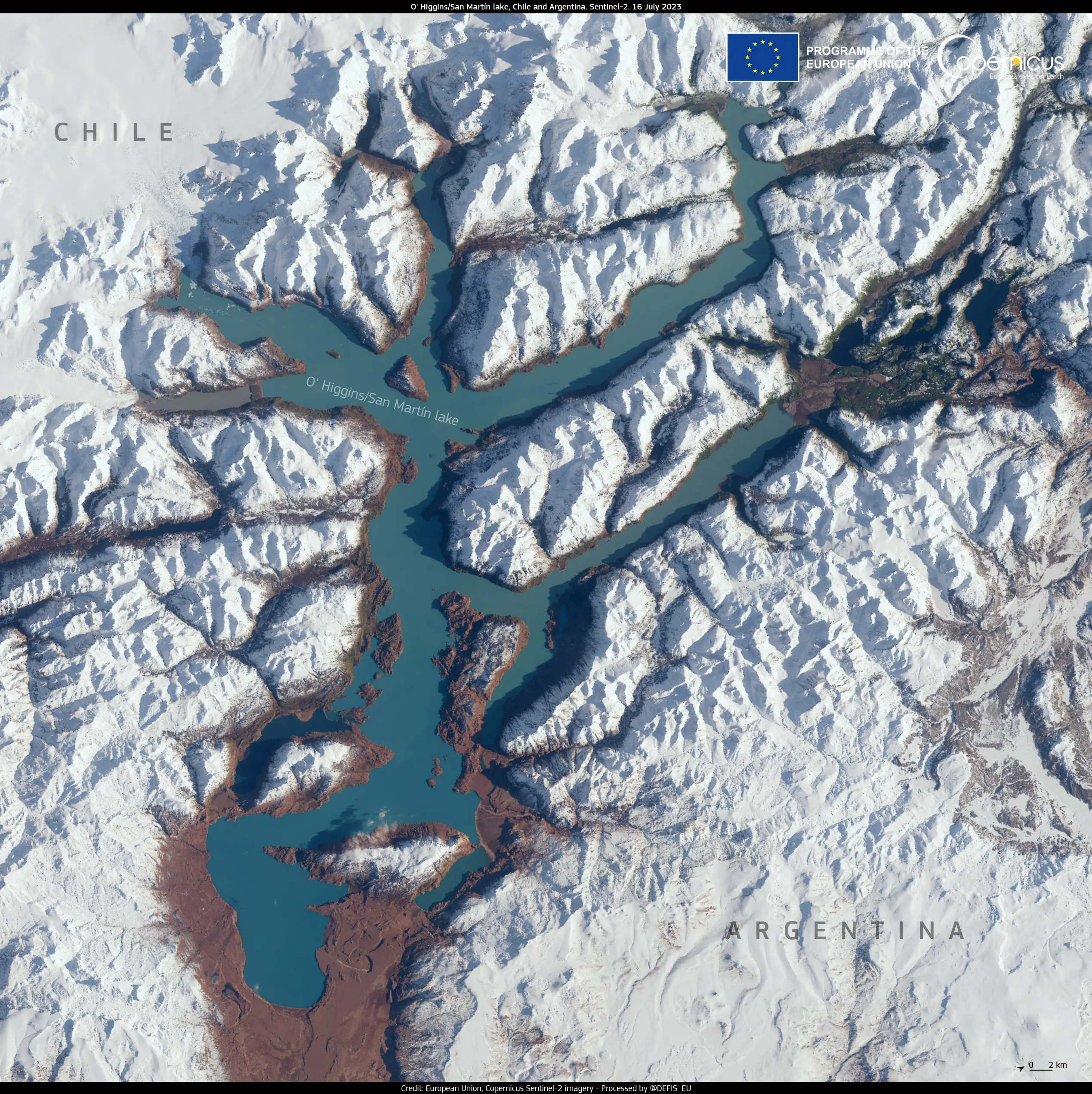 On the same day, One of the Copernicus Sentinel-2 satellites captured this cloud-free view of one of the Andean lakes where the low T° were recorded.