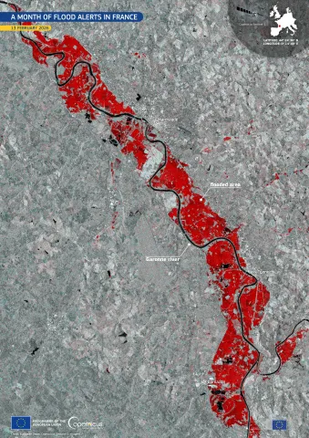 Among the latest low-pressure weather systems, Storm Nils affected south-western France, causing the Garonne River to overflow, inundating roads and residential areas in the region of Bordeaux. The flooded areas are visible in red tones in this image acquired by one of the Copernicus Sentinel-1 satellites on 13 February 2026.
