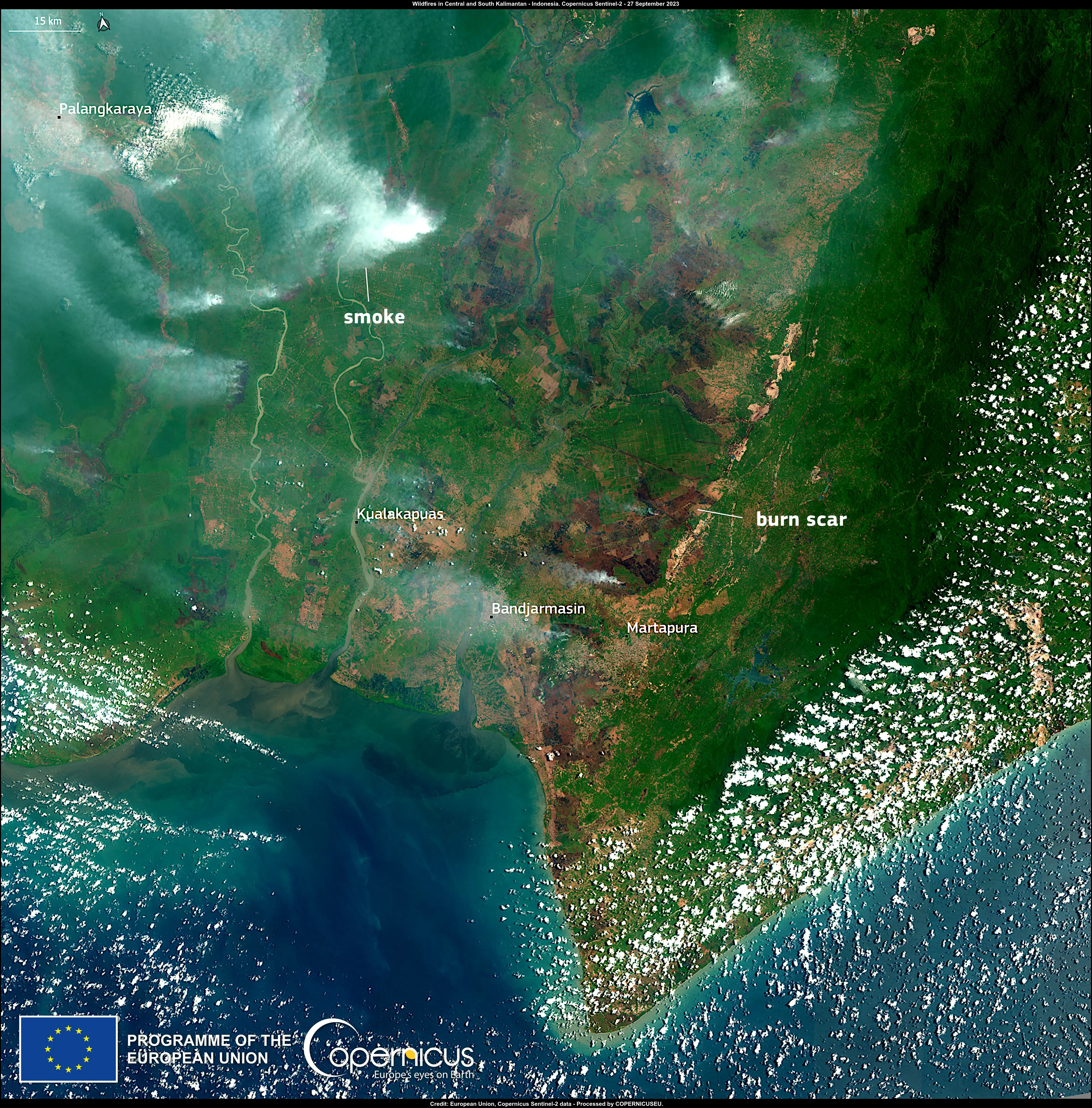 This image, acquired by one of the Copernicus Sentinel-2 satellites on 27 September 2023, shows the smoke clouds caused by the wildfires that are burning the peatlands of the Central and South Kalimantan provinces in Indonesia.