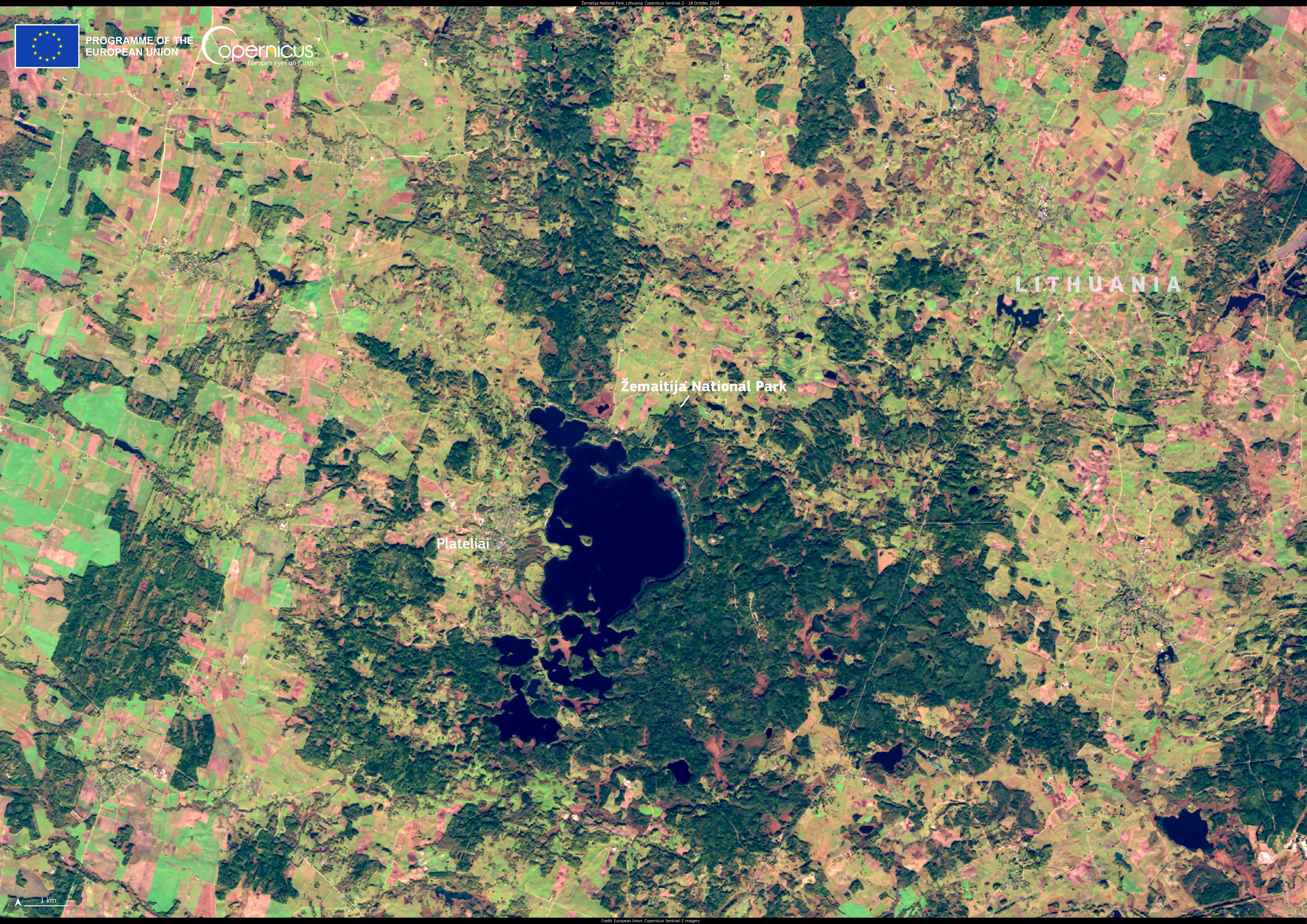 This Copernicus Sentinel-2 image, acquired on 18 October 2024, shows Žemaitija National Park in Lithuania.