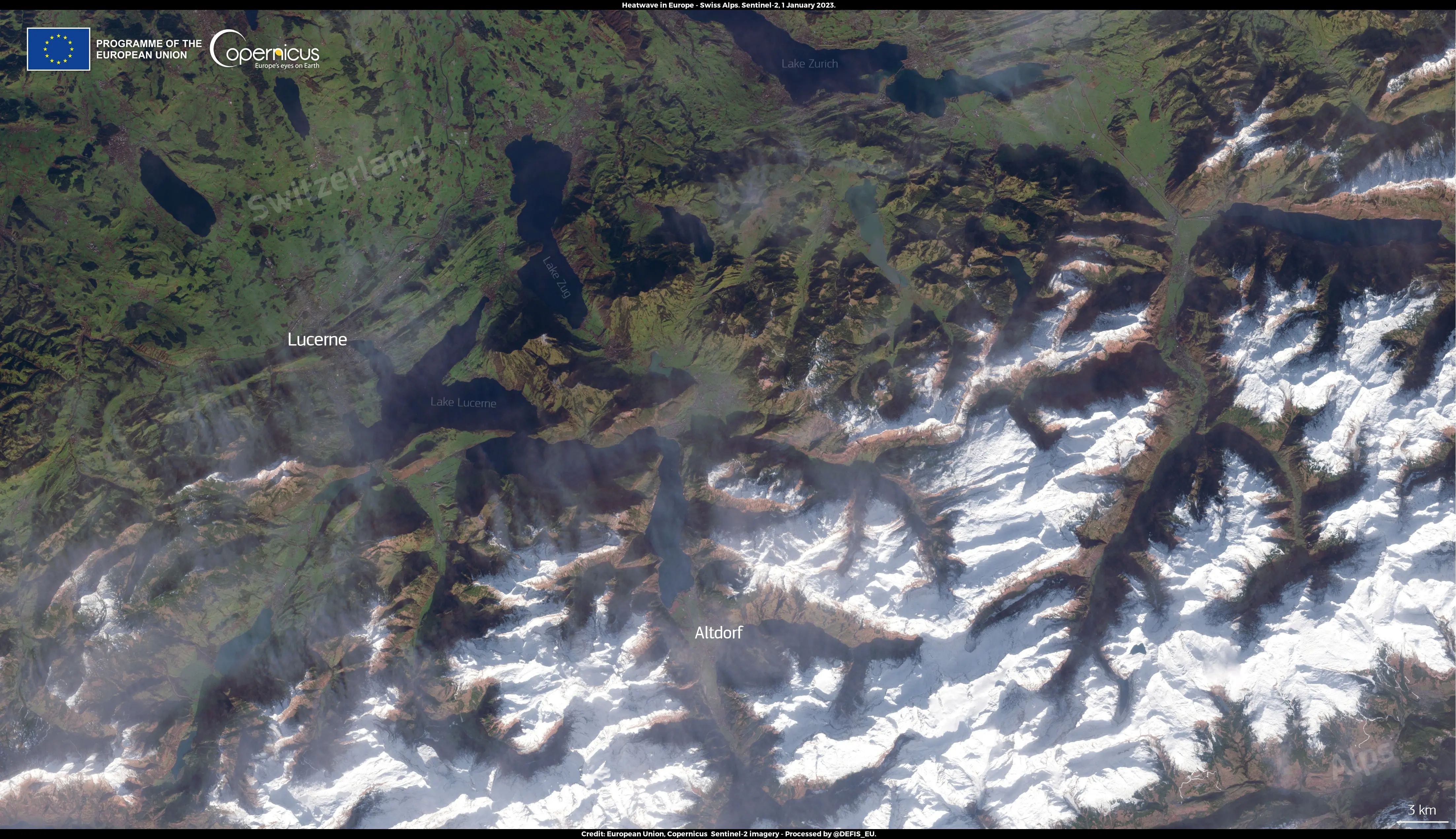 This image, acquired by one of the Copernicus Sentinel-2 satellites on 1 January 2023, shows Altdorf, a Swiss town where the temperature reached 19.2°C and did not fall below 16.1°C during the night, breaking the previous record, set in 1864.