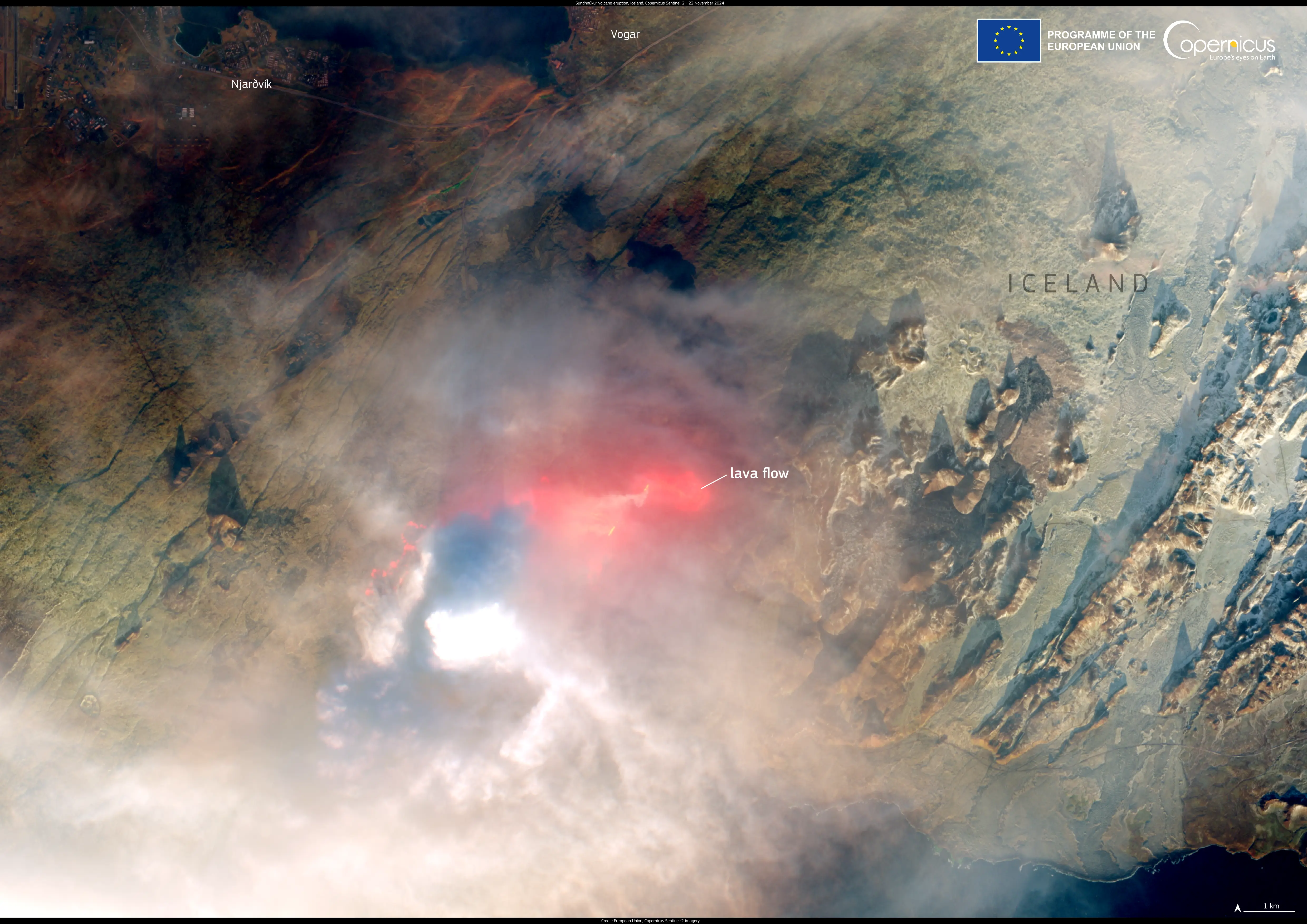 The lava flow emitted by the Sundhnúkur volcano is visible in this Copernicus Sentinel-2 image acquired on 22 November.