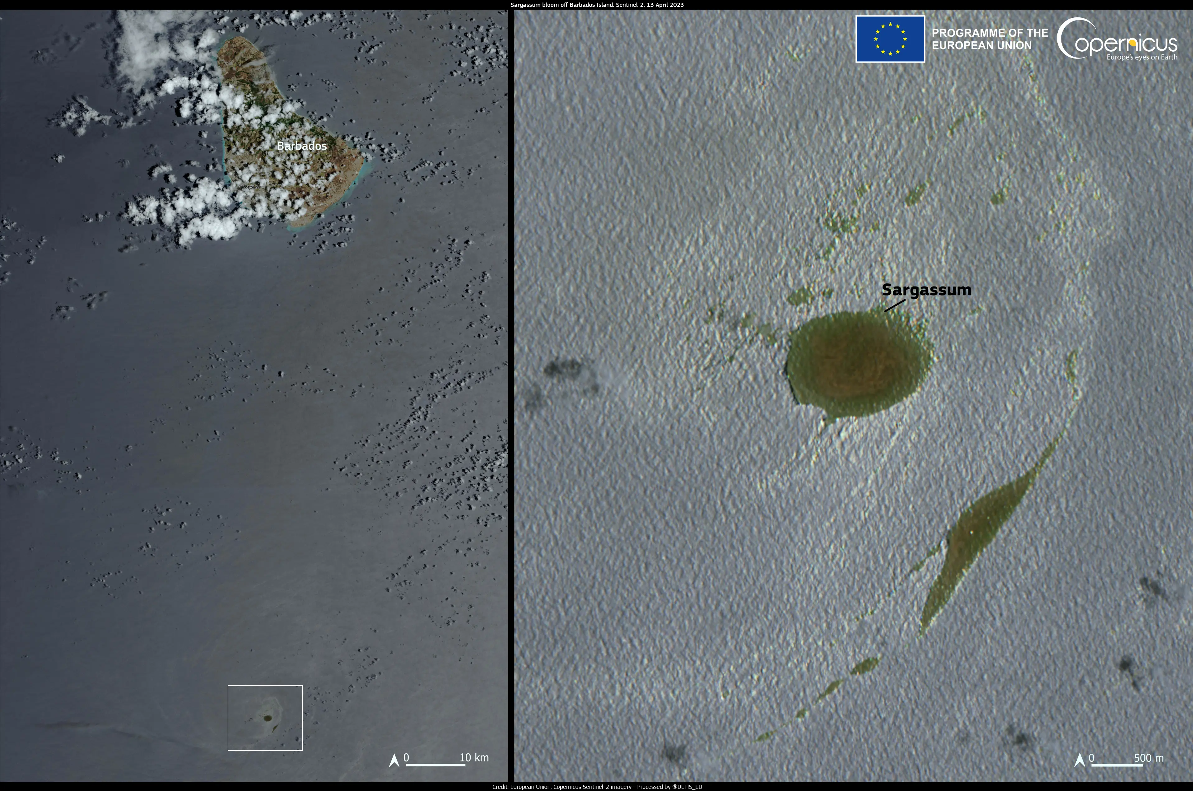On 13 April, one of the Copernicus Sentinel-2 satellites imaged a massive mat of algae measuring over 1 km in width south of Barbados.