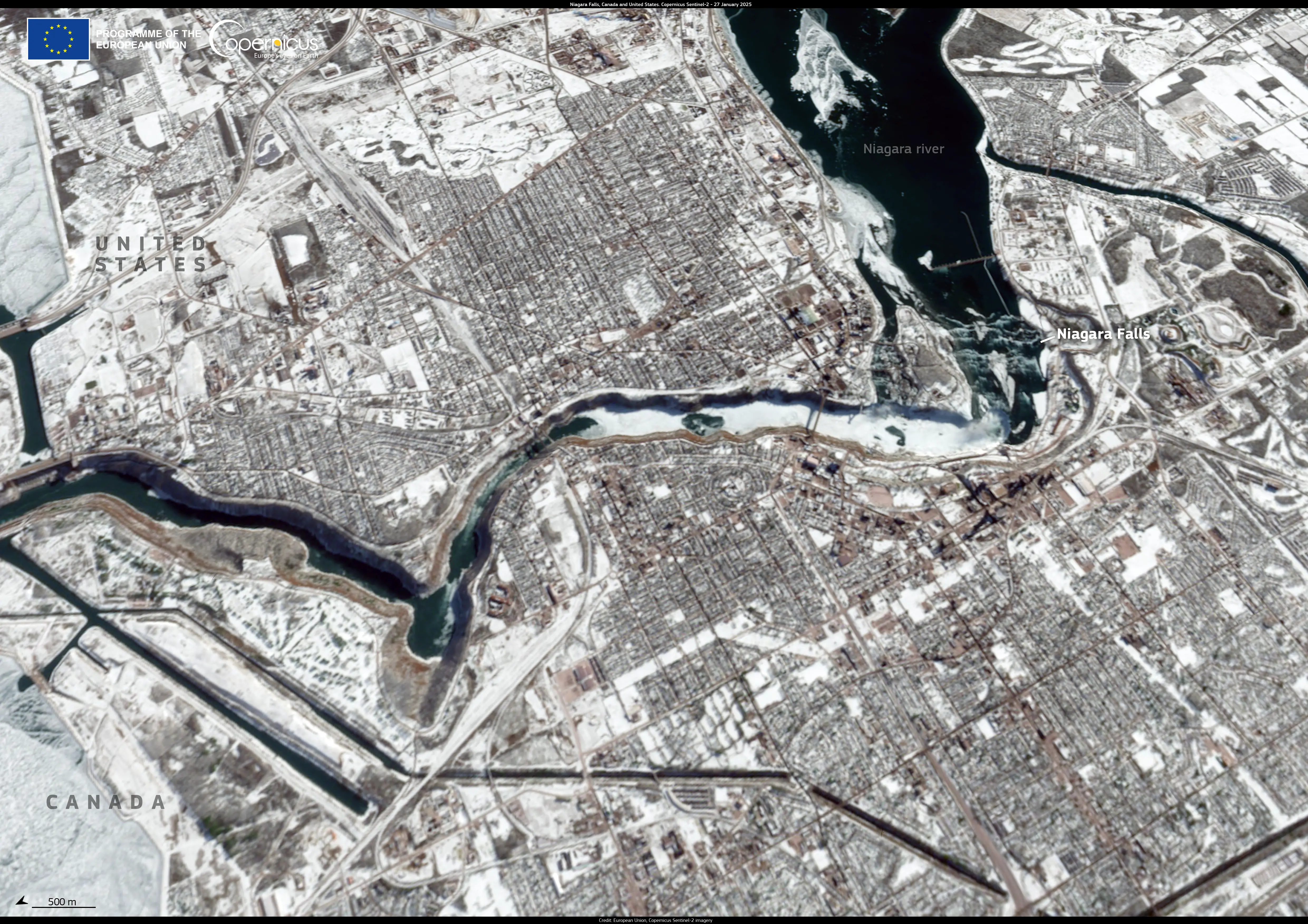 In this Copernicus Sentinel-2 image acquired on 27 January 2025, the partially frozen Niagara Falls can be seen from above.